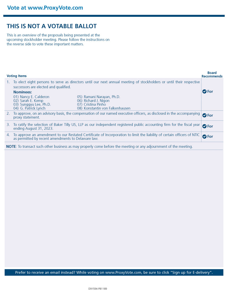 Vote at www.ProxyVote.com THIS IS NOT A VOTABLE BALLOT This is an overview of the proposals being presented at the upcoming stockholder meeting. Please follow the instructions on the reverse side to vote these important matters. Prefer to receive an email instead? While voting on www.ProxyVote.com, be sure to click “Sign up for E - delivery”. Voting Items Board Recommends 1. To elect eight persons to serve as directors until our next annual meeting of stockholders or until their respective successors are elected and qualified. Nominees: 1) Nancy E. Calderon 05) Ramani Narayan, Ph.D. 2) Sarah E. Kemp 06) Richard J. Nigon 3) Sunggyu Lee, Ph.D. 07) Cristina Pinho 4) G. Patrick Lynch 08) Konstantin von Falkenhausen For 2. To approve, on an advisory basis, the compensation of our named executive officers, as disclosed in the accompanying proxy statement. For 3. To ratify the selection of Baker Tilly US, LLP as our independent registered public accounting firm for the fiscal year ending August 31, 2023. For 4. To approve an amendment to our Restated Certificate of Incorporation to limit the liability of certain officers of NTIC as permitted by recent amendments to Delaware law. For NOTE : To transact such other business as may properly come before the meeting or any adjournment of the meeting. D91594 - P81189