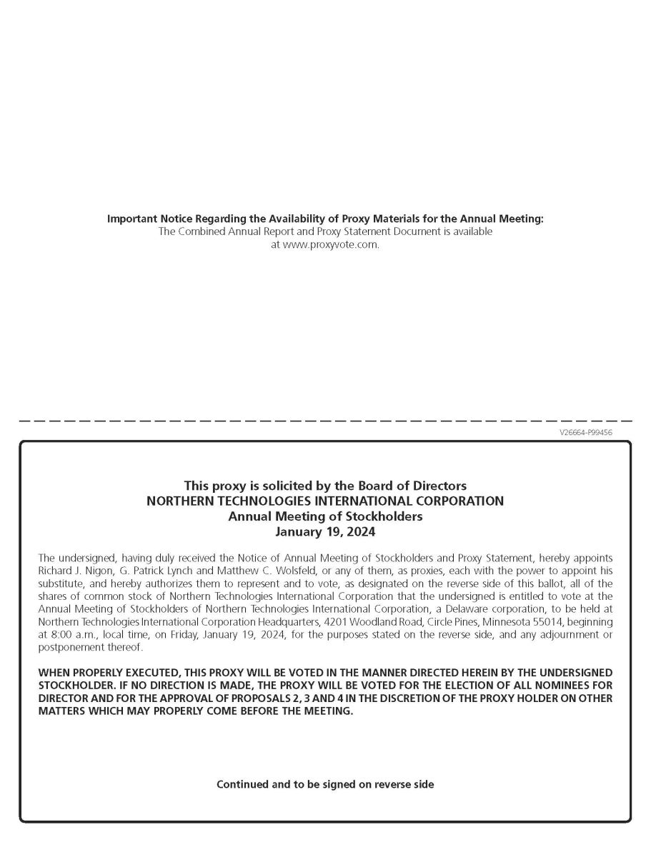 V24804 - P99456 Important Notice Regarding the Availability of Proxy Materials for the Annual Meeting: The Combined Annual Report and Proxy Statement Document is available at www.proxyvote.com. This proxy is solicited by the Board of Directors NORTHERN TECHNOLOGIES INTERNATIONAL CORPORATION Annual Meeting of Stockholders January 19, 2024 The undersigned, having duly received the Notice of Annual Meeting of Stockholders and Proxy Statement, hereby appoints Richard J .. Nigon, G . Patrick Lynch and Matthew C . Wolsfeld, or any of them, as proxies, each with the power to appoint his substitute, and hereby authorizes them to represent and to vote, as