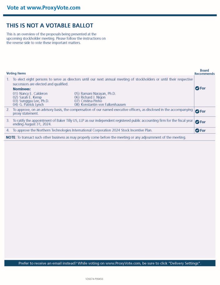 Vote at www.ProxyVote.com THIS IS NOT A VOTABLE BALLOT This is an overview of the proposals being presented at the upcoming stockholder meeting. Please follow the instructions on the reverse side to vote these important matters. Voting Items Board Recommends For 1. To elect eight persons to serve as directors until our next annual meeting of stockholders or until their respective successors are elected and qualified. Nominees: 1) Nancy E. Calderon 05) Ramani Narayan, Ph.D. 2) Sarah E. Kemp 06) Richard J. Nigon 3) Sunggyu Lee, Ph.D. 07) Cristina Pinho 4) G. Patrick Lynch 08) Konstantin von Falkenhausen For 2. To approve, on an advisory basis, the compensation of our named executive officers, as disclosed in the accompanying proxy statement. For 3. To ratify the appointment of Baker Tilly US, LLP as our independent registered public accounting firm for the fiscal year ending August 31, 2024. For 4. To approve the Northern Technologies International Corporation 2024 Stock Incentive Plan. NOTE : To transact such other business as may properly come before the meeting or any adjournment of the meeting. V26674 - P99456 Prefer to receive an email instead? While voting on www.ProxyVote.com, be sure to click “Delivery Settings”.