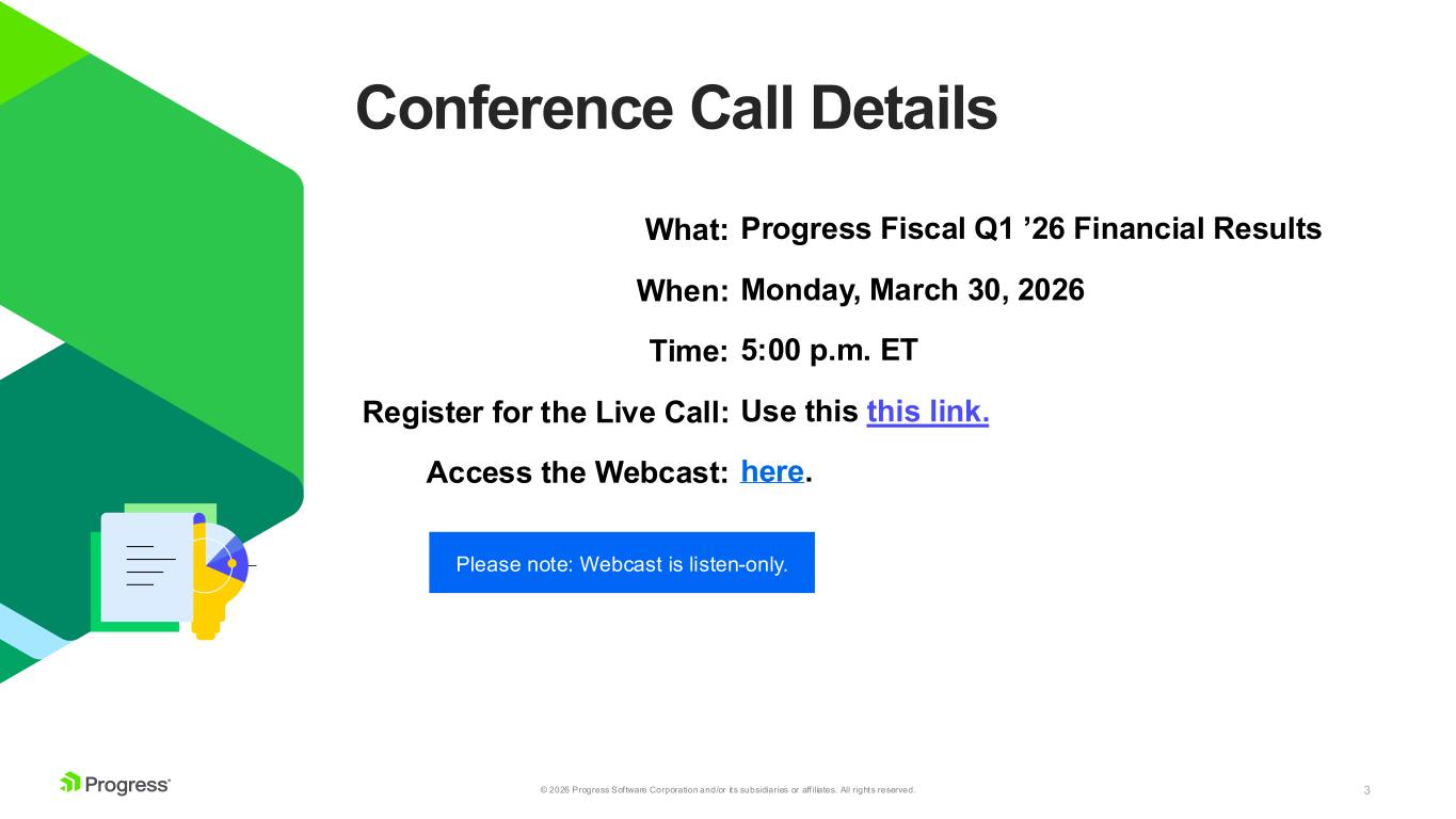 2© 2026 Progress Software Corporation and/or its subsidiaries or aff iliates. All rights reserved. Forward Looking Statements This presentation contains statements that are “forward-looking statements” within the meaning of Section 27A of the Securities Act of 1933, as amended, and Section 21E of the Securities Exchange Act of 1934, as amended. Progress has identified some of these forward-looking statements with words like “believe,” “may,” “could,” “would,” “might,” “should,” “expect,” “intend,” “plan,” “target,” “anticipate” and “continue,” the negative of these words, other terms of similar meaning or the use of future dates. Forward-looking statements in this presentation include, but are not limited to, statements regarding Progress’s strategy; future revenue growth, operating margin, and cost savings; future acquisitions; and other statements regarding the future operation, direction, prospects, and success of Progress’s business. There are a number of factors that could cause actual results or future performance or achievements to differ materially from those anticipated by the forward-looking statements, including, without limitation: (i) economic, geopolitical, and market conditions can adversely affect our business, results of operations, and financial condition, including our revenue growth and profitability, which in turn could adversely affect our stock price; (ii) our international sales and operations subject us to additional risks that can adversely affect our operating results, including risks relating to foreign currency gains and losses; (iii) we may fail to achieve our financial forecasts due to such factors as delays or size reductions in transactions, fewer large transactions in a particular quarter, fluctuations in currency exchange rates, or a decline in our renewal rates for contracts; (iv) if the security measures for our software, services, other offerings or our internal information technology infrastructure are compromised or subject to a successful cyber-attack, or if our software offerings contain significant coding or configuration errors or zero-day vulnerabilities, we may experience reputational harm, legal claims and financial exposure; and the results of inquiries, investigations, and legal claims regarding the MOVEit Vulnerability remain uncertain, while the ultimate resolution of these matters could result in losses that may be material to our financial results for a particular period; and (v) future acquisitions may not be successful or may involve unanticipated costs or other integration issues that could disrupt our existing operations. For further information regarding risks and uncertainties associated with Progress' business, please refer to Progress' filings with the U.S. Securities and Exchange Commission, including our quarterly report on Form 10-Q for the fiscal quarter ending February 28, 2026, and our Annual Report on Form 10-K for the fiscal year ended November 30, 2025. Progress undertakes no obligation to update any forward-looking statements, which speak only as of the date of this presentation. Non-GAAP Financial Measures We refer to certain non-GAAP financial measures in this presentation, including but not limited to, non-GAAP revenue, non-GAAP income from operations and operating margin, adjusted free cash flow, annualized recurring revenue ("ARR"), Net Retention Rate ("NRR"), and non-GAAP diluted earnings per share. These non-GAAP measures are not prepared in accordance with generally accepted accounting principles (“GAAP”). Please see "Important Information Regarding Non-GAAP Financial Information" below for additional information. A reconciliation between non-GAAP measures and the most directly comparable GAAP measures appears in our earnings press release for the fiscal first quarter ended February 28, 2026, and fiscal full year ended November 30, 2025, which is furnished on a Form 8-K concurrently with this presentation and is available in the Investor Relations section of our website.