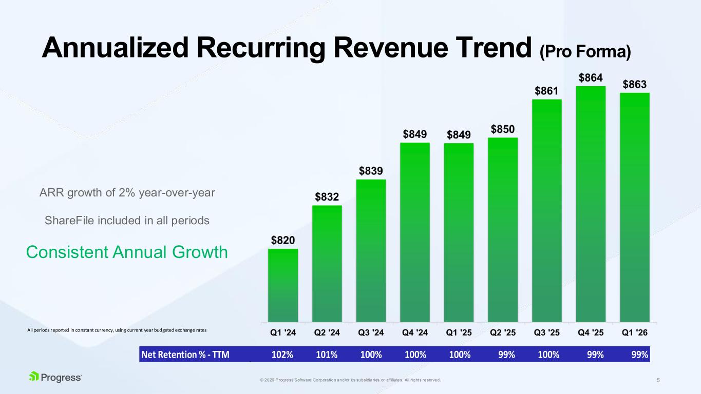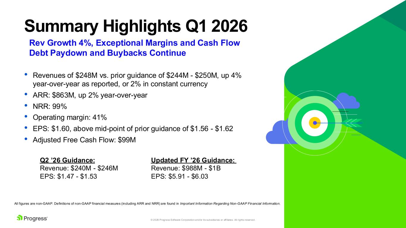 4© 2026 Progress Software Corporation and/or its subsidiaries or aff iliates. All rights reserved. Summary Highlights Q1 2026 • Revenues of $248M vs. prior guidance of $244M - $250M, up 4% year-over-year as reported, or 2% in constant currency • ARR: $863M, up 2% year-over-year • NRR: 99% • Operating margin: 41% • EPS: $1.60, above mid-point of prior guidance of $1.56 - $1.62 • Adjusted Free Cash Flow: $99M All f igures are non-GAAP. Definitions of non-GAAP financial measures (including ARR and NRR) are found in Important Information Regarding Non-GAAP Financial Information. Rev Growth 4%, Exceptional Margins and Cash Flow Debt Paydown and Buybacks Continue Updated FY ’26 Guidance: Revenue: $988M - $1B EPS: $5.91 - $6.03 Q2 ’26 Guidance: Revenue: $240M - $246M EPS: $1.47 - $1.53