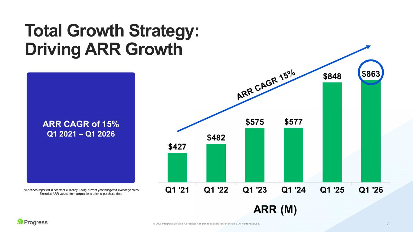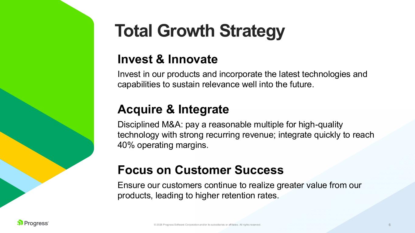6© 2026 Progress Software Corporation and/or its subsidiaries or aff iliates. All rights reserved. Total Growth Strategy Invest & Innovate Invest in our products and incorporate the latest technologies and capabilities to sustain relevance well into the future. Acquire & Integrate Disciplined M&A: pay a reasonable multiple for high-quality technology with strong recurring revenue; integrate quickly to reach 40% operating margins. Focus on Customer Success Ensure our customers continue to realize greater value from our products, leading to higher retention rates.