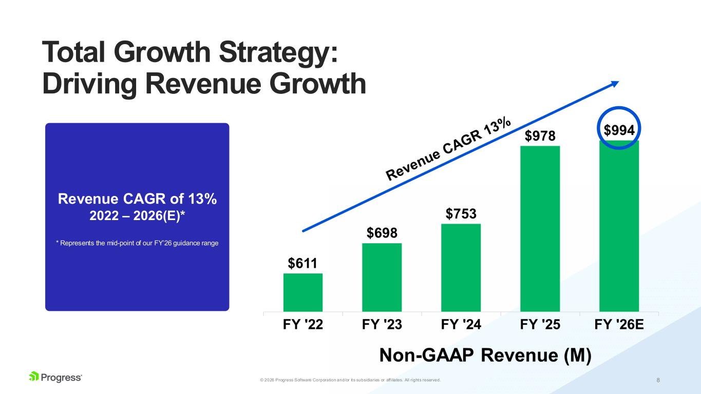 7© 2026 Progress Software Corporation and/or its subsidiaries or aff iliates. All rights reserved. Total Growth Strategy: Driving ARR Growth ARR CAGR of 15% Q1 2021 – Q1 2026 All periods reported in constant currency, using current year budgeted exchange rates Excludes ARR values from acquisitions prior to purchase date