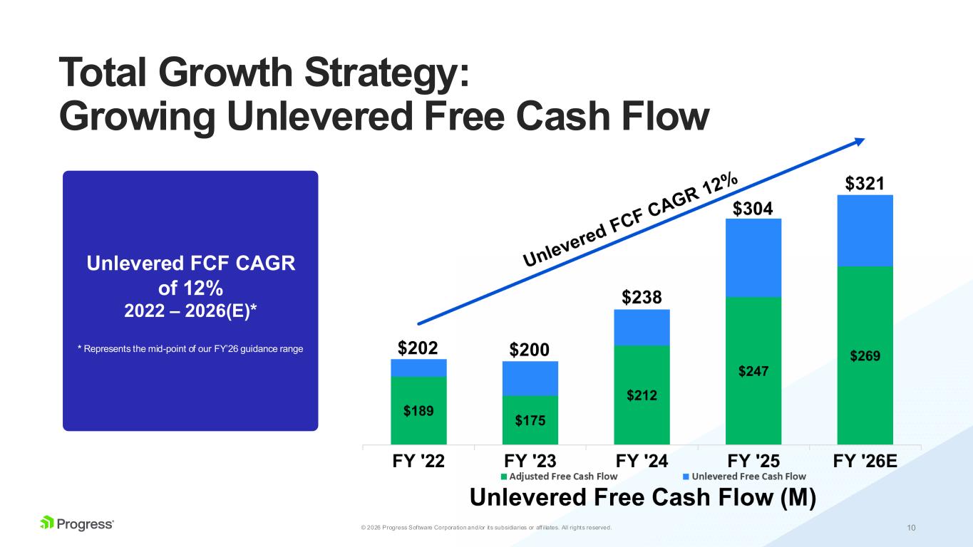 9© 2026 Progress Software Corporation and/or its subsidiaries or aff iliates. All rights reserved. Operating Income CAGR of 13% 2022 – 2026(E)* Best-in-class non-GAAP operating margins consistently above 35% * Represents the mid-point of our FY’26 guidance range Total Growth Strategy: Growing Profitability