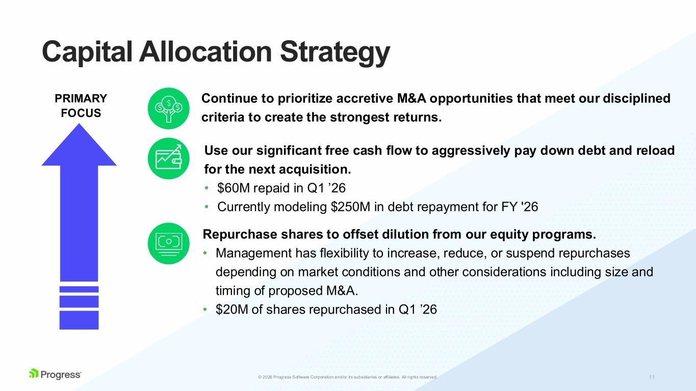 11© 2025 Progress Software Corporation and/or its subsidiaries or aff iliates. All rights reserved.6 Capital Allocation Strategy PRIMARY FOCUS Continue to prioritize accretive M&A opportunities that meet our disciplined criteria to create the strongest returns. Repurchase shares to offset dilution from our equity programs. • Management has flexibility to increase, reduce, or suspend repurchases depending on market conditions and other considerations including size and timing of proposed M&A. • $20M of shares repurchased in Q1 ’26 Use our significant free cash flow to aggressively pay down debt and reload for the next acquisition. • $60M repaid in Q1 ’26 • Currently modeling $250M in debt repayment for FY '26