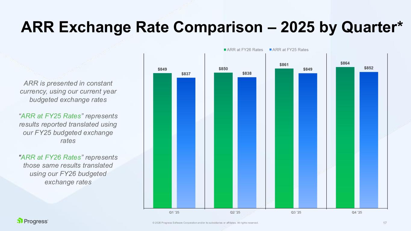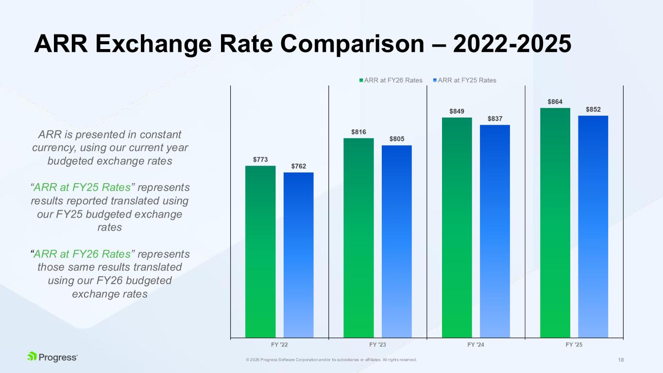 17© 2026 Progress Software Corporation and/or its subsidiaries or aff iliates. All rights reserved. ARR Exchange Rate Comparison – 2025 by Quarter* ARR is presented in constant currency, using our current year budgeted exchange rates “ARR at FY25 Rates” represents results reported translated using our FY25 budgeted exchange rates “ARR at FY26 Rates” represents those same results translated using our FY26 budgeted exchange rates