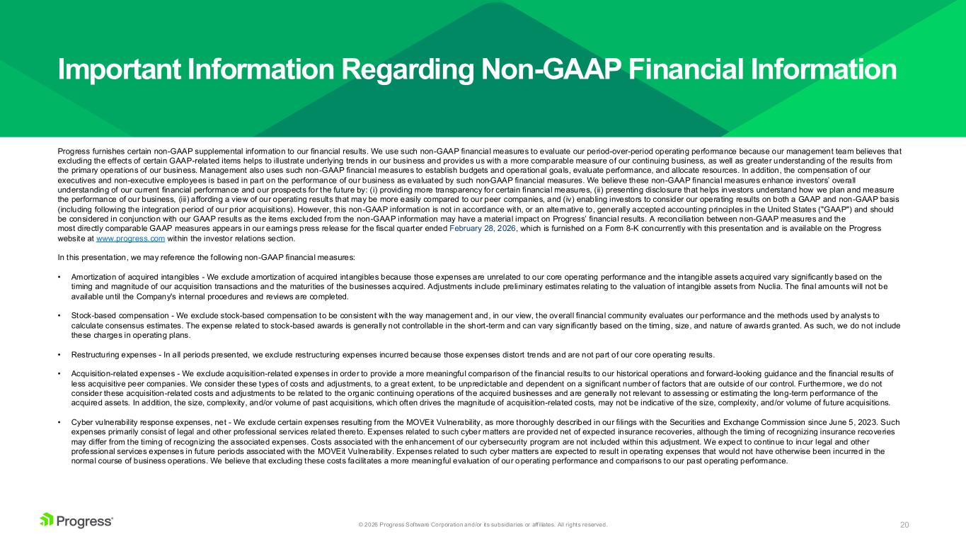 20© 2026 Progress Software Corporation and/or its subsidiaries or aff iliates. All rights reserved. Progress furnishes certain non-GAAP supplemental information to our financial results. We use such non-GAAP financial measures to evaluate our period-over-period operating performance because our management team believes that excluding the effects of certain GAAP-related items helps to illustrate underlying trends in our business and provides us with a more comparable measure of our continuing business, as well as greater understanding of the results from the primary operations of our business. Management also uses such non-GAAP financial measures to establish budgets and operational goals, evaluate performance, and allocate resources. In addition, the compensation of our executives and non-executive employees is based in part on the performance of our business as evaluated by such non-GAAP financial measures. We believe these non-GAAP financial measures enhance investors’ overall understanding of our current financial performance and our prospects for the future by: (i) providing more transparency for certain financial measures, (ii) presenting disclosure that helps investors understand how we plan and measure the performance of our business, (iii) affording a view of our operating results that may be more easily compared to our peer companies, and (iv) enabling investors to consider our operating results on both a GAAP and non-GAAP basis (including following the integration period of our prior acquisit ions). However, this non-GAAP information is not in accordance with, or an alternative to, generally accepted accounting principles in the United States ("GAAP") and should be considered in conjunction with our GAAP results as the items excluded from the non-GAAP information may have a material impact on Progress’ financial results. A reconciliation between non-GAAP measures and the most directly comparable GAAP measures appears in our earnings press release for the fiscal quarter ended February 28, 2026, which is furnished on a Form 8-K concurrently with this presentation and is available on the Progress website at www.progress.com within the investor relations section. In this presentation, we may reference the following non-GAAP financial measures: • Amortization of acquired intangibles - We exclude amortization of acquired intangibles because those expenses are unrelated to our core operating performance and the intangible assets acquired vary significantly based on the timing and magnitude of our acquisition transactions and the maturities of the businesses acquired. Adjustments include preliminary estimates relating to the valuation of intangible assets from Nuclia. The final amounts will not be available until the Company's internal procedures and reviews are completed. • Stock-based compensation - We exclude stock-based compensation to be consistent with the way management and, in our view, the overall financial community evaluates our performance and the methods used by analysts to calculate consensus estimates. The expense related to stock-based awards is generally not controllable in the short-term and can vary significantly based on the timing, size, and nature of awards granted. As such, we do not include these charges in operating plans. • Restructuring expenses - In all periods presented, we exclude restructuring expenses incurred because those expenses distort trends and are not part of our core operating results. • Acquisition-related expenses - We exclude acquisition-related expenses in order to provide a more meaningful comparison of the financial results to our historical operations and forward-looking guidance and the financial results of less acquisitive peer companies. We consider these types of costs and adjustments, to a great extent, to be unpredictable and dependent on a significant number of factors that are outside of our control. Furthermore, we do not consider these acquisition-related costs and adjustments to be related to the organic continuing operations of the acquired businesses and are generally not relevant to assessing or estimating the long-term performance of the acquired assets. In addition, the size, complexity, and/or volume of past acquisitions, which often drives the magnitude of acquisit ion-related costs, may not be indicative of the size, complexity, and/or volume of future acquisitions. • Cyber vulnerability response expenses, net - We exclude certain expenses resulting from the MOVEit Vulnerability, as more thoroughly described in our filings with the Securities and Exchange Commission since June 5, 2023. Such expenses primarily consist of legal and other professional services related thereto. Expenses related to such cyber matters are provided net of expected insurance recoveries, although the timing of recognizing insurance recoveries may differ from the timing of recognizing the associated expenses. Costs associated with the enhancement of our cybersecurity program are not included within this adjustment. We expect to continue to incur legal and other professional services expenses in future periods associated with the MOVEit Vulnerability. Expenses related to such cyber matters are expected to result in operating expenses that would not have otherwise been incurred in the normal course of business operations. We believe that excluding these costs facilitates a more meaningful evaluation of our operating performance and comparisons to our past operating performance. Important Information Regarding Non-GAAP Financial Information