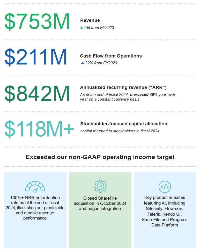 As we have for decades, in 2024, Progress remained focused on empowering our customers, our people, and our products. Throughout the year, the Board and executive leadership collaborated closely to ensure that Progress effectively executed its Total Growth Strategy, and the financial, strategic and business results delivered in fiscal 2024 demonstrated the success of our approach.