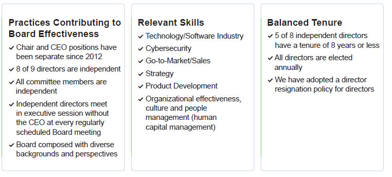 Current Board nominees represent a wide range of backgrounds and expertise. We believe our varied experiences, perspectives and skills contribute to the Board’s effectiveness in managing risk and providing guidance that positions Progress for long-term success in a changing business environment. Of our nine Board nominees, eight are independent, which includes our Board Chair and all committee members. This Proxy Statement describes Progress’ corporate governance policies and practices that foster the Board’s effective oversight of the Company’s business strategies and practices.