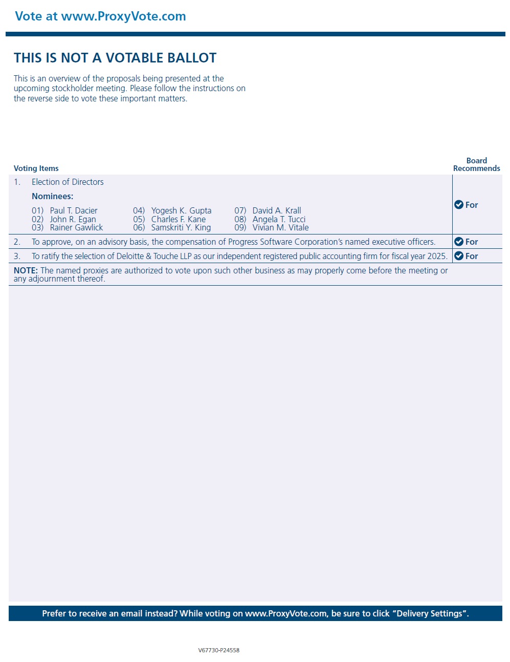 THIS IS NOT A VOTABLE BALLOT This is an overview of the proposals being presented at the upcoming stockholder meeting. Please follow the instructions on the reverse side to vote these important matters. Vote at www.ProxyVote.com Prefer to receive an email instead? While voting on www.ProxyVote.com, be sure to click “Delivery Settings”. Voting Items Board Recommends V67730-P24558 1. Election of Directors For Nominees: 01) Paul T. Dacier 02) John R. Egan 03) Rainer Gawlick 04) Yogesh K. Gupta 05) Charles F. Kane 06) Samskriti Y. King 07) David A. Krall 08) Angela T. Tucci 09) Vivian M. Vitale 2. To approve, on an advisory basis, the compensation of Progress Software Corporation’s named executive officers. For 3. To ratify the selection of Deloitte & Touche LLP as our independent registered public accounting firm for fiscal year 2025. For NOTE: The named proxies are authorized to vote upon such other business as may properly come before the meeting or any adjournment thereof.