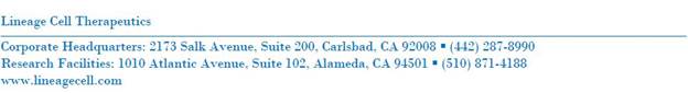 | RE: | Lineage Cell Therapeutics, Inc. |