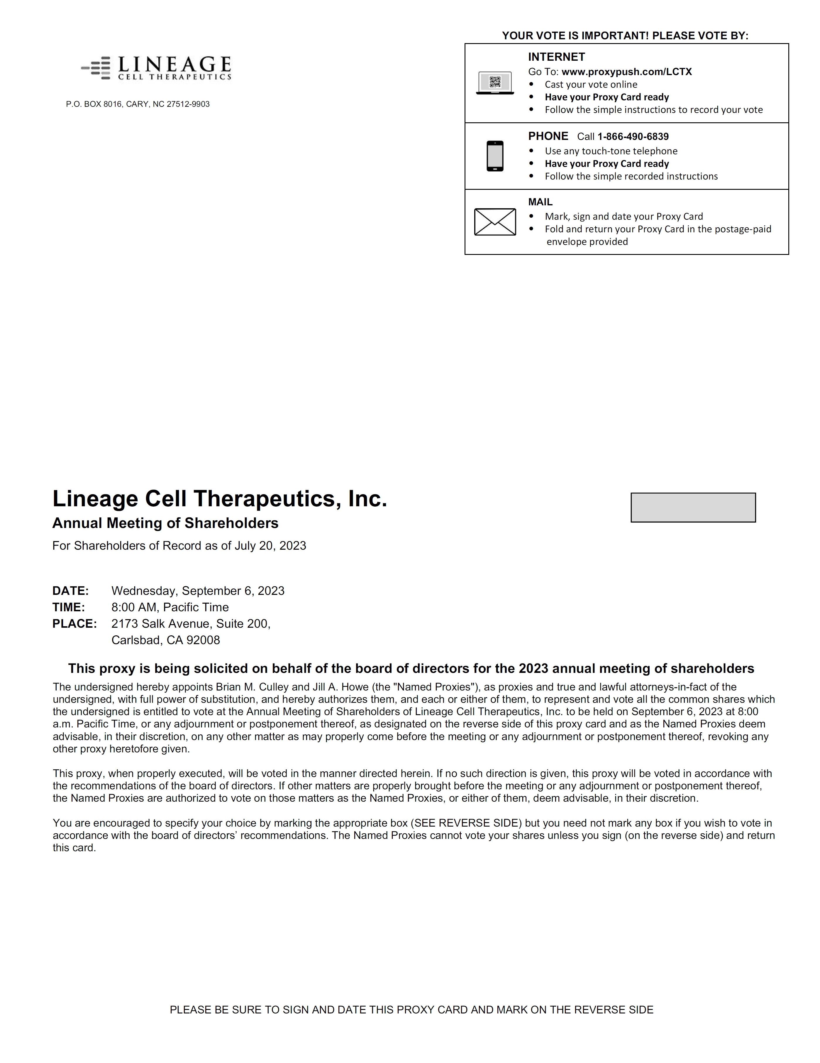 | ● | By Internet: You may vote at www.proxypush.com/LCTX, 24 hours a day, seven days a week. You will need the control number included on your Notice of Internet Availability of Proxy Materials or proxy card. Votes submitted via the Internet must be received by 11:59 p.m., Eastern Time, on September 5, 2023. | |