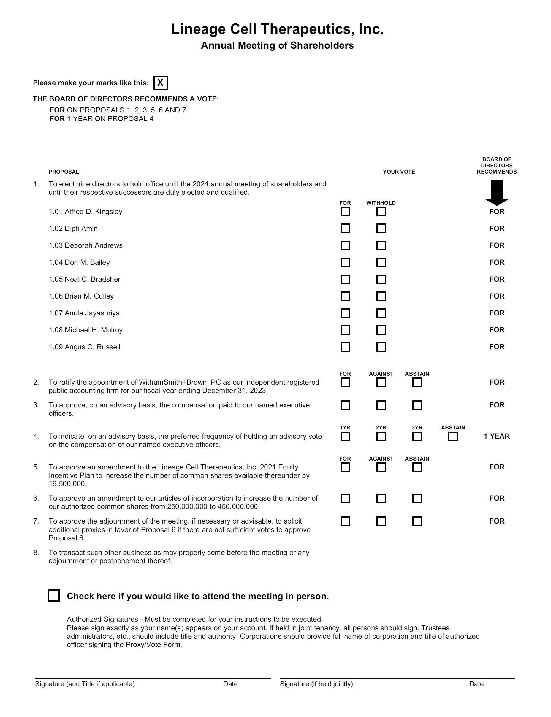 The 2023 annual meeting of shareholders (the “Meeting”) of Lineage Cell Therapeutics, Inc. (“Lineage,” “we,” “us,” and “our”) will be held at 2173 Salk Avenue, Suite 200, Carlsbad, CA 92008 on September 6, 2023 at 8:00 a.m. Pacific Time for the following purposes: