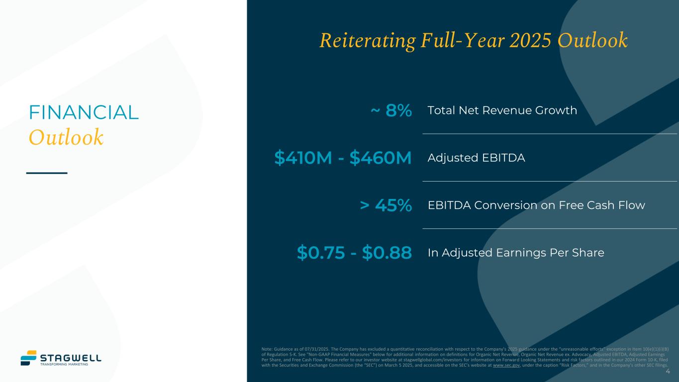 DEFINITIONS OF NON-GAAP FINANCIAL MEASURES 3 In addition to its reported results, Stagwell Inc. has included in this earnings presentation certain financial results that the Securities and Exchange Commission (SEC) defines as "non-GAAP Financial Measures." Management believes that such non-GAAP financial measures, when read in conjunction with the Company's reported results, can provide useful supplemental information for investors analyzing period to period comparisons of the Company's results. Such non-GAAP financial measures include the following: Pro Forma Results: The Pro Forma amounts presented for each period were prepared by combining the historical standalone statements of operations for each of legacy MDC and SMG. The unaudited pro forma results are provided for illustrative purposes only and do not purport to represent what the actual consolidated results of operations or consolidated financial condition would have been had the combination actually occurred on the date indicated, nor do they purport to project the future consolidated results of operations or consolidated financial condition for any future period or as of any future date. The Company has excluded a quantitative reconciliation of Adjusted Pro Forma EBITDA to net income under the “unreasonable efforts” exception in Item 10(e)(1)(i)(B) of Regulation S-K. 1) Organic Revenue: “Organic revenue growth” and “organic revenue decline” refer to the positive or negative results, respectively, of subtracting both the foreign exchange and acquisition (disposition) components from total revenue growth. The acquisition (disposition) component is calculated by aggregating prior period revenue for any acquired businesses, less the prior period revenue of any businesses that were disposed of during the current period. The organic revenue growth (decline) component reflects the constant currency impact of (a) the change in revenue of the partner firms that the Company has held throughout each of the comparable periods presented, and (b) “non-GAAP acquisitions (dispositions), net”. Non-GAAP acquisitions (dispositions), net consists of (i) for acquisitions during the current year, the revenue effect from such acquisition as if the acquisition had been owned during the equivalent period in the prior year and (ii) for acquisitions during the previous year, the revenue effect from such acquisitions as if they had been owned during that entire year (or same period as the current reportable period), taking into account their respective pre-acquisition revenues for the applicable periods, and (iii) for dispositions, the revenue effect from such disposition as if they had been disposed of during the equivalent period in the prior year. 2) Net New Business: Estimate of annualized revenue for new wins less annualized revenue for losses incurred in the period. 3) Adjusted EBITDA: defined as Net income excluding non-operating income or expense to achieve operating income, plus depreciation and amortization, stock-based compensation, deferred acquisition consideration adjustments, and other items. Other items include restructuring costs, acquisition-related expenses, and nonrecurring items. 4) Adjusted Diluted EPS is defined as (i) Net income (loss) attributable to Stagwell Inc. common shareholders, plus net income attributable to Class C shareholders, excluding amortization expense, impairment and other losses, stock-based compensation, deferred acquisition consideration adjustments, discrete tax items, and other items, divided by (ii) (a) the per weighted average number of common shares outstanding plus (b) the weighted average number of Class C shares outstanding (if dilutive). Other items includes restructuring costs, acquisition- related expenses, and non-recurring items, and subject to the anti-dilution rules. 5) Free Cash Flow: defined as Adjusted EBITDA less capital expenditures, change in net working capital, cash taxes, interest, and distributions to minority interests, but excludes contingent M&A payments. 6) Financial Guidance: The Company provides guidance on a non-GAAP basis as it cannot predict certain elements which are included in reported GAAP results. Included in this earnings presentation are tables reconciling reported Stagwell Inc. results to arrive at certain of these non-GAAP financial measures.