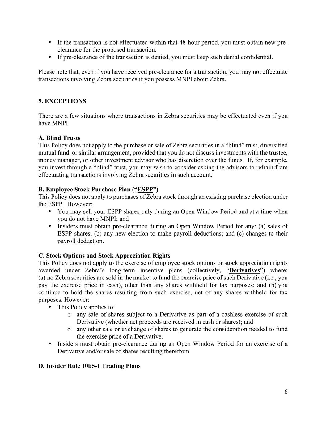 6 If the transaction is not effectuated within that 48-hour period, you must obtain new pre- clearance for the proposed transaction. If pre-clearance of the transaction is denied, you must keep such denial confidential. Please note that, even if you have received pre-clearance for a transaction, you may not effectuate transactions involving Zebra securities if you possess MNPI about Zebra. 5. EXCEPTIONS There are a few situations where transactions in Zebra securities may be effectuated even if you have MNPI. A. Blind Trusts This Policy does not apply to the purchase or sale of Zebra securities in a “blind” trust, diversified mutual fund, or similar arrangement, provided that you do not discuss investments with the trustee, money manager, or other investment advisor who has discretion over the funds. If, for example, you invest through a “blind” trust, you may wish to consider asking the advisors to refrain from effectuating transactions involving Zebra securities in such account. B. Employee Stock Purchase Plan (“ESPP”) This Policy does not apply to purchases of Zebra stock through an existing purchase election under the ESPP. However: You may sell your ESPP shares only during an Open Window Period and at a time when you do not have MNPI; and Insiders must obtain pre-clearance during an Open Window Period for any: (a) sales of ESPP shares; (b) any new election to make payroll deductions; and (c) changes to their payroll deduction. C. Stock Options and Stock Appreciation Rights This Policy does not apply to the exercise of employee stock options or stock appreciation rights awarded under Zebra’s long-term incentive plans (collectively, “Derivatives”) where: (a) no Zebra securities are sold in the market to fund the exercise price of such Derivative (i.e., you pay the exercise price in cash), other than any shares withheld for tax purposes; and (b) you continue to hold the shares resulting from such exercise, net of any shares withheld for tax purposes. However: This Policy applies to: o any sale of shares subject to a Derivative as part of a cashless exercise of such Derivative (whether net proceeds are received in cash or shares); and o any other sale or exchange of shares to generate the consideration needed to fund the exercise price of a Derivative. Insiders must obtain pre-clearance during an Open Window Period for an exercise of a Derivative and/or sale of shares resulting therefrom. D. Insider Rule 10b5-1 Trading Plans