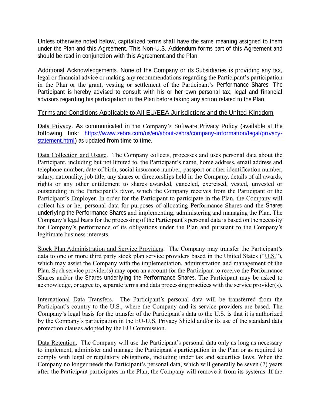 Unless otherwise noted below, capitalized terms shall have the same meaning assigned to them under the Plan and this Agreement. This Non-U.S. Addendum forms part of this Agreement and should be read in conjunction with this Agreement and the Plan. Additional Acknowledgements. None of the Company or its Subsidiaries is providing any tax, legal or financial advice or making any recommendations regarding the Participant’s participation in the Plan or the grant, vesting or settlement of the Participant’s Performance Shares. The Participant is hereby advised to consult with his or her own personal tax, legal and financial advisors regarding his participation in the Plan before taking any action related to the Plan. Terms and Conditions Applicable to All EU/EEA Jurisdictions and the United Kingdom Data Privacy. As communicated in the Company’s Software Privacy Policy (available at the following link: https://www.zebra.com/us/en/about-zebra/company-information/legal/privacy- statement.html) as updated from time to time. Data Collection and Usage. The Company collects, processes and uses personal data about the Participant, including but not limited to, the Participant’s name, home address, email address and telephone number, date of birth, social insurance number, passport or other identification number, salary, nationality, job title, any shares or directorships held in the Company, details of all awards, rights or any other entitlement to shares awarded, canceled, exercised, vested, unvested or outstanding in the Participant’s favor, which the Company receives from the Participant or the Participant’s Employer. In order for the Participant to participate in the Plan, the Company will collect his or her personal data for purposes of allocating Performance Shares and the Shares underlying the Performance Shares and implementing, administering and managing the Plan. The Company’s legal basis for the processing of the Participant’s personal data is based on the necessity for Company’s performance of its obligations under the Plan and pursuant to the Company’s legitimate business interests. Stock Plan Administration and Service Providers. The Company may transfer the Participant’s data to one or more third party stock plan service providers based in the United States (“U.S.”), which may assist the Company with the implementation, administration and management of the Plan. Such service provider(s) may open an account for the Participant to receive the Performance Shares and/or the Shares underlying the Performance Shares. The Participant may be asked to acknowledge, or agree to, separate terms and data processing practices with the service provider(s). International Data Transfers. The Participant’s personal data will be transferred from the Participant’s country to the U.S., where the Company and its service providers are based. The Company’s legal basis for the transfer of the Participant’s data to the U.S. is that it is authorized by the Company’s participation in the EU-U.S. Privacy Shield and/or its use of the standard data protection clauses adopted by the EU Commission. Data Retention. The Company will use the Participant’s personal data only as long as necessary to implement, administer and manage the Participant’s participation in the Plan or as required to comply with legal or regulatory obligations, including under tax and securities laws. When the Company no longer needs the Participant’s personal data, which will generally be seven (7) years after the Participant participates in the Plan, the Company will remove it from its systems. If the