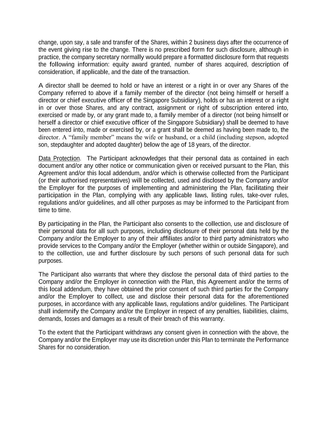change, upon say, a sale and transfer of the Shares, within 2 business days after the occurrence of the event giving rise to the change. There is no prescribed form for such disclosure, although in practice, the company secretary normally would prepare a formatted disclosure form that requests the following information: equity award granted, number of shares acquired, description of consideration, if applicable, and the date of the transaction. A director shall be deemed to hold or have an interest or a right in or over any Shares of the Company referred to above if a family member of the director (not being himself or herself a director or chief executive officer of the Singapore Subsidiary), holds or has an interest or a right in or over those Shares, and any contract, assignment or right of subscription entered into, exercised or made by, or any grant made to, a family member of a director (not being himself or herself a director or chief executive officer of the Singapore Subsidiary) shall be deemed to have been entered into, made or exercised by, or a grant shall be deemed as having been made to, the director. A “family member” means the wife or husband, or a child (including stepson, adopted son, stepdaughter and adopted daughter) below the age of 18 years, of the director. Data Protection. The Participant acknowledges that their personal data as contained in each document and/or any other notice or communication given or received pursuant to the Plan, this Agreement and/or this local addendum, and/or which is otherwise collected from the Participant (or their authorised representatives) will be collected, used and disclosed by the Company and/or the Employer for the purposes of implementing and administering the Plan, facilitating their participation in the Plan, complying with any applicable laws, listing rules, take-over rules, regulations and/or guidelines, and all other purposes as may be informed to the Participant from time to time. By participating in the Plan, the Participant also consents to the collection, use and disclosure of their personal data for all such purposes, including disclosure of their personal data held by the Company and/or the Employer to any of their affiliates and/or to third party administrators who provide services to the Company and/or the Employer (whether within or outside Singapore), and to the collection, use and further disclosure by such persons of such personal data for such purposes. The Participant also warrants that where they disclose the personal data of third parties to the Company and/or the Employer in connection with the Plan, this Agreement and/or the terms of this local addendum, they have obtained the prior consent of such third parties for the Company and/or the Employer to collect, use and disclose their personal data for the aforementioned purposes, in accordance with any applicable laws, regulations and/or guidelines. The Participant shall indemnify the Company and/or the Employer in respect of any penalties, liabilities, claims, demands, losses and damages as a result of their breach of this warranty. To the extent that the Participant withdraws any consent given in connection with the above, the Company and/or the Employer may use its discretion under this Plan to terminate the Performance Shares for no consideration.
