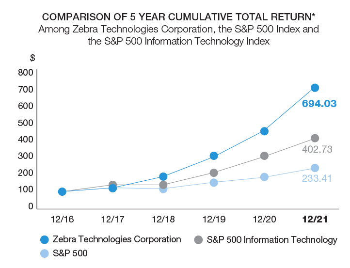 In 2021, Zebra celebrated the 30th anniversary of its initial public offering. Since the offering, Zebra’s stock has significantly outperformed the broader markets. I am proud of the extraordinary success and sustained growth Zebra has achieved through the focused execution of its Enterprise Asset Intelligence vision over the past several years of enabling every asset and worker to be visible, connected, and fully optimized so that our customers can gain a performance edge.