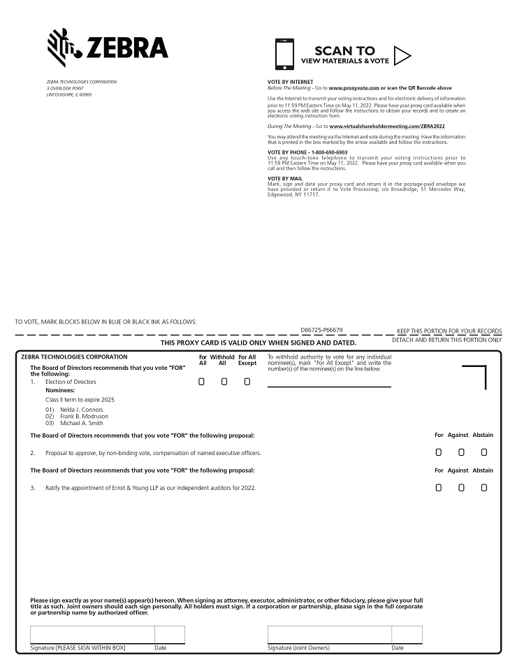 Your vote on the matters to be considered at the Annual Meeting is important, regardless of the size of your holdings. Whether or not you plan to virtually view or participate in the Annual Meeting, we urge you to vote your shares as soon as possible via the Internet or by telephone. If you received a paper copy of the proxy card by mail, you may sign and return the proxy card in the envelope provided, or may request a proxy card to complete, sign, date and return by mail. By voting in advance of the Annual Meeting, you can ensure your shares will be represented and voted at the Annual Meeting, and you will spare Zebra the expense of a follow-up mailing. Even if you vote before the Annual Meeting, you may still attend the Annual Meeting via the internet at www.virtualshareholdermeeting.com/ZBRA2022 and submit questions and vote during the Annual Meeting by entering the 16-digit control number found on your proxy card.