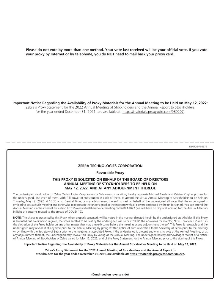 Please join us for the Zebra Technologies Corporation 2022 Annual Meeting of Stockholders (the “Annual Meeting”) on Thursday, May 12, 2022 at 10:30 a.m., Central Time. The Annual Meeting will be conducted solely by remote communication, in a virtual only format. This decision was made in light of concerns related to the spread of COVID-19 and to support the health and wellbeing of the Company’s stockholders, employees and directors. Stockholders will not be able to attend the Annual Meeting in person. You may attend the virtual Annual Meeting at www.virtualshareholdermeeting.com/ZBRA2022. Only stockholders of record as of the close of business on March 18, 2022 can participate at the Annual Meeting. Stockholders of record will need their 16-digit control number found on their proxy card, voting instruction form or notice to enter the Annual Meeting. Once admitted, stockholders of record may vote or submit questions during the Annual Meeting by typing their question into the “Ask a Question” field and clicking “Submit.” Only questions pertinent to Annual Meeting matters will be answered during the Annual Meeting, subject to time constraints. If any questions pertinent to Annual Meeting matters cannot be answered during the Annual Meeting due to time constraints, we will post and answer a representative set of these questions online at investors.zebra.com, under the Events section. The questions and answers will be available as soon as reasonably practicable after the Annual Meeting and will remain available until one week after posting.