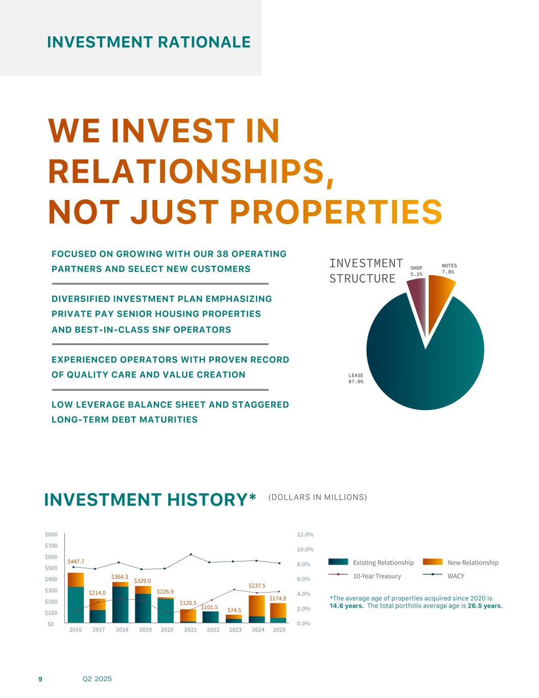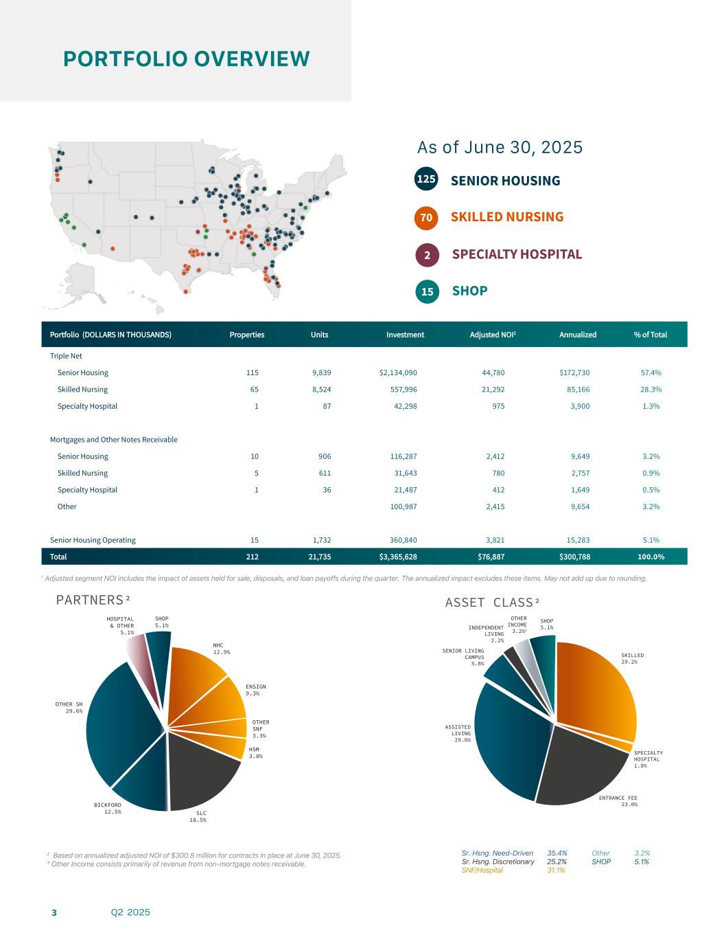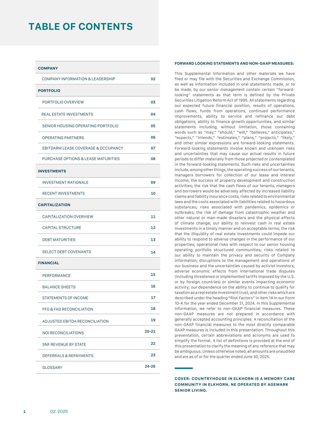 TABLE OF CONTENTS 1 Q2 2025 COVER: COUNTRYHOUSE IN ELKHORN IS A MEMORY CARE COMMUNITY IN ELKHORN, NE OPERATED BY AGEMARK SENIOR LIVING. FORWARD LOOKING STATEMENTS AND NON-GAAP MEASURES: This Supplemental Information and other materials we have filed or may file with the Securities and Exchange Commission, as well as information included in oral statements made, or to be made, by our senior management contain certain “forward- looking” statements as that term is defined by the Private Securities Litigation Reform Act of 1995. All statements regarding our expected future financial position, results of operations, cash flows, funds from operations, continued performance improvements, ability to service and refinance our debt obligations, ability to finance growth opportunities, and similar statements including, without limitation, those containing words such as “may,” “should,” “will,” “believes,” anticipates,” “expects,” “intends,” “estimates,” “plans,” “projects,” “likely,” and other similar expressions are forward-looking statements. Forward-looking statements involve known and unknown risks and uncertainties that may cause our actual results in future periods to differ materially from those projected or contemplated in the forward-looking statements. Such risks and uncertainties include, among other things, the operating success of our tenants, managers borrowers for collection of our lease and interest income; the success of property development and construction activities; the risk that the cash flows of our tenants, managers and borrowers would be adversely affected by increased liability claims and liability insurance costs; risks related to environmental laws and the costs associated with liabilities related to hazardous substances; risks associated with pandemics, epidemics or outbreaks; the risk of damage from catastrophic weather and other natural or man-made disasters and the physical effects of climate change; our ability to reinvest cash in real estate investments in a timely manner and on acceptable terms; the risk that the illiquidity of real estate investments could impede our ability to respond to adverse changes in the performance of our properties; operational risks with respect to our senior housing operating portfolio structured communities; risks related to our ability to maintain the privacy and security of Company information; disruptions to the management and operations of our business and the uncertainties caused by activist investors; adverse economic effects from international trade disputes (including threatened or implemented tariffs imposed by the U.S. or by foreign countries) or similar events impacting economic activity; our dependence on the ability to continue to qualify for taxation as a real estate investment trust; and other risks which are described under the heading “Risk Factors” in Item 1A in our Form 10-K for the year ended December 31, 2024. In this Supplemental Information, we refer to non-GAAP financial measures. These non-GAAP measures are not prepared in accordance with generally accepted accounting principles. A reconciliation of the non-GAAP financial measures to the most directly comparable GAAP measures is included in this presentation. Throughout this presentation, certain abbreviations and acronyms are used to simplify the format. A list of definitions is provided at the end of this presentation to clarify the meaning of any reference that may be ambiguous. Unless otherwise noted, all amounts are unaudited and are as of or for the quarter ended June 30, 2025. COMPANY COMPANY INFORMATION & LEADERSHIP PORTFOLIO PORTFOLIO OVERVIEW REAL ESTATE INVESTMENTS SENIOR HOUSING OPERATING PORTFOLIO EBITDARM LEASE COVERAGE & OCCUPANCY PURCHASE OPTIONS & LEASE MATURITIES INVESTMENTS INVESTMENT RATIONALE RECENT INVESTMENTS CAPITALIZATION 10 CAPITALIZATION OVERVIEW CAPITAL STRUCTURE DEBT MATURITIES NOI RECONCILIATIONS SNF REVENUE BY STATE DEFERRALS & REPAYMENTS GLOSSARY SELECT DEBT COVENANTS FINANCIAL PERFORMANCE BALANCE SHEETS STATEMENTS OF INCOME ADJUSTED EBITDA RECONCILIATION FFO & FAD RECONCILIATION OPERATING PARTNERS 02 03 04 05 07 08 09 11 12 13 14 15 16 17 18 19 20-21 22 23 24-26 06