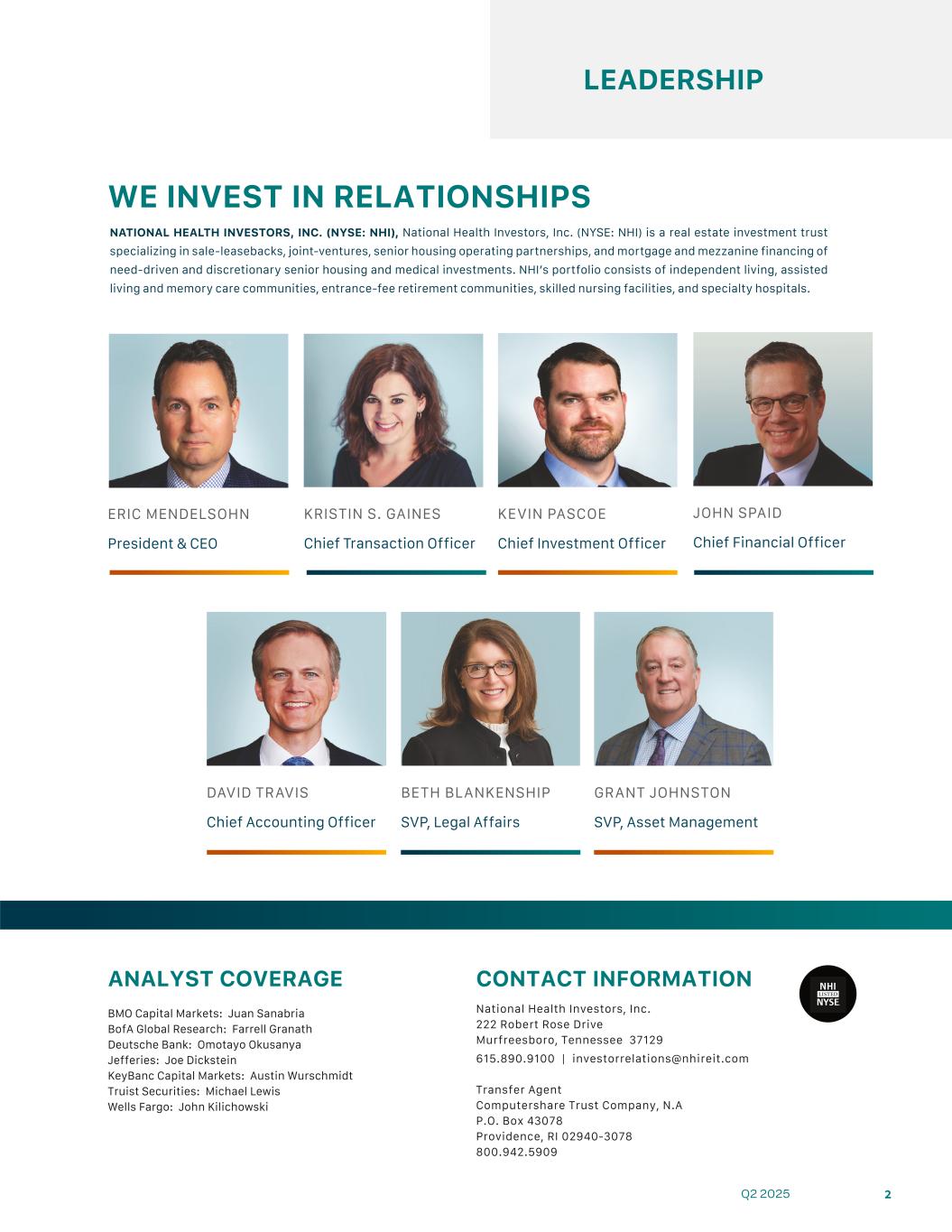 2Q2 2025 WE INVEST IN RELATIONSHIPS KRISTIN S. GAINES Chief Transaction Offi cer KEVIN PASCOE Chief Investment Offi cer JOHN SPAID Chief Financial Offi cer ERIC MENDELSOHN President & CEO DAVID TRAVIS Chief Accounting Offi cer GRANT JOHNSTON SVP, Asset Management BETH BLANKENSHIP SVP, Legal Affairs ANALYST COVERAGE BMO Capital Markets: Juan Sanabria BofA Global Research: Farrell Granath Deutsche Bank: Omotayo Okusanya Jefferies: Joe Dickstein KeyBanc Capital Markets: Austin Wurschmidt Truist Securities: Michael Lewis Wells Fargo: John Kilichowski CONTACT INFORMATION National Health Investors, Inc. 222 Robert Rose Drive Murfreesboro, Tennessee 37129 615.890.9100 | investorrelations@nhireit.com Transfer Agent Computershare Trust Company, N.A P.O. Box 43078 Providence, RI 02940-3078 800.942.5909 NATIONAL HEALTH INVESTORS, INC. (NYSE: NHI), National Health Investors, Inc. (NYSE: NHI) is a real estate investment trust specializing in sale-leasebacks, joint-ventures, senior housing operating partnerships, and mortgage and mezzanine fi nancing of need-driven and discretionary senior housing and medical investments. NHI’s portfolio consists of independent living, assisted living and memory care communities, entrance-fee retirement communities, skilled nursing facilities, and specialty hospitals. LEADERSHIP