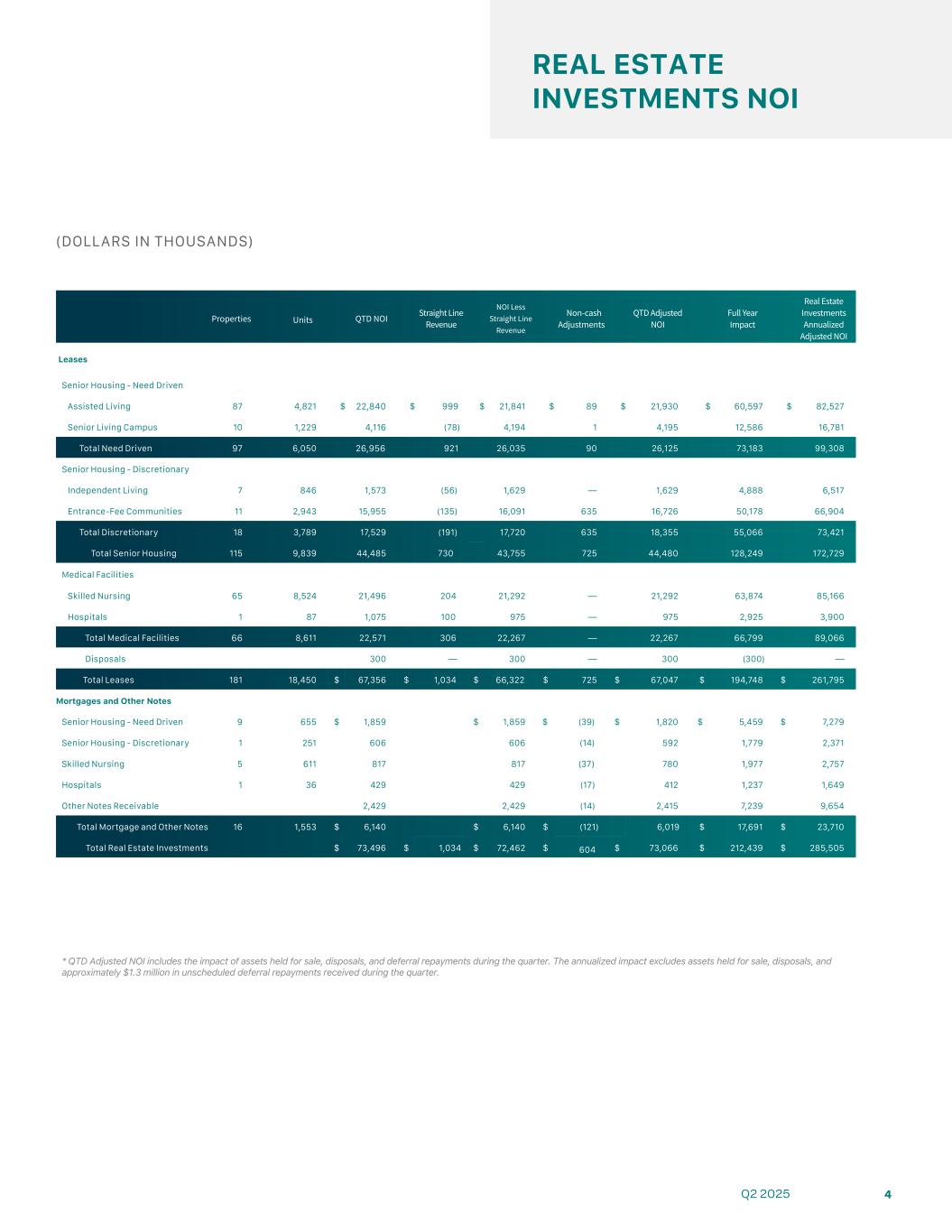 4Q2 2025 ’ Ž Ž “ŠŽ ’ ”• Š – Leases Senior Housing - Need Driven Assisted Living 87 4,821 $ 22,840 $ 999 $ 21,841 $ 89 $ 21,930 $ 60,597 $ 82,527 Senior Living Campus 10 1,229 4,116 (78) 4,194 1 4,195 12,586 16,781 Total Need Driven 97 6,050 26,956 921 26,035 90 26,125 73,183 99,308 Senior Housing - Discretionary Independent Living 7 846 1,573 (56) 1,629 — 1,629 4,888 6,517 Entrance-Fee Communities 11 2,943 15,955 (135) 16,091 635 16,726 50,178 66,904 Total Discretionary 18 3,789 17,529 (191) 17,720 635 18,355 55,066 73,421 Total Senior Housing 115 9,839 44,485 730 43,755 725 44,480 128,249 172,729 Medical Facilities Skilled Nursing 65 8,524 21,496 204 21,292 — 21,292 63,874 85,166 Hospitals 1 87 1,075 100 975 — 975 2,925 3,900 Total Medical Facilities 66 8,611 22,571 306 22,267 — 22,267 66,799 89,066 Disposals 300 — 300 — 300 (300) — Total Leases 181 18,450 $ 67,356 $ 1,034 $ 66,322 $ 725 $ 67,047 $ 194,748 $ 261,795 Mortgages and Other Notes Senior Housing - Need Driven 9 655 $ 1,859 $ 1,859 $ (39) $ 1,820 $ 5,459 $ 7,279 Senior Housing - Discretionary 1 251 606 606 (14) 592 1,779 2,371 Skilled Nursing 5 611 817 817 (37) 780 1,977 2,757 Hospitals 1 36 429 429 (17) 412 1,237 1,649 Other Notes Receivable 2,429 2,429 (14) 2,415 7,239 9,654 Total Mortgage and Other Notes 16 1,553 $ 6,140 $ 6,140 $ (121) 6,019 $ 17,691 $ 23,710 Total Real Estate Investments $ 73,496 $ 1,034 $ 72,462 $ 604 $ 73,066 $ 212,439 $ 285,505 * QTD Adjusted NOI includes the impact of assets held for sale, disposals, and deferral repayments during the quarter. The annualized impact excludes assets held for sale, disposals, and approximately $1.3 million in unscheduled deferral repayments received during the quarter. REAL ESTATE INVESTMENTS NOI (DOLLARS IN THOUSANDS)