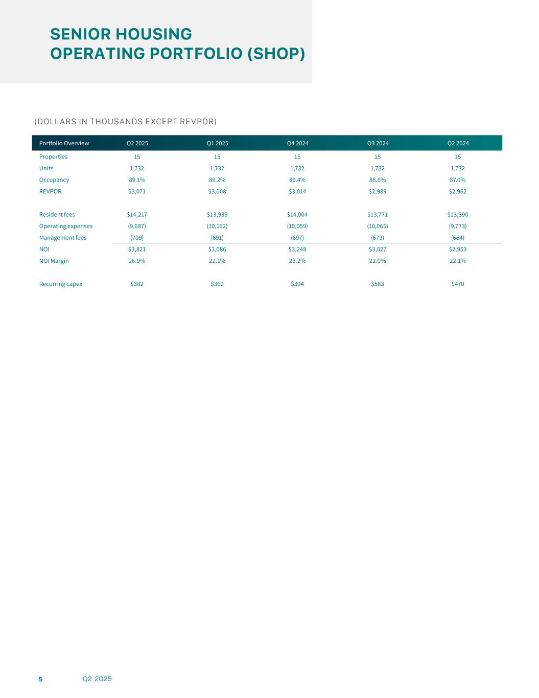 5 Q2 2025 SENIOR HOUSING OPERATING PORTFOLIO (SHOP) — ’ƒƒ…ƒ ’ƒ…ƒ ’„ƒ…ƒ„ ’€ƒ…ƒ„ ’ƒƒ…ƒ„ †€ƒ †€ƒ †€ƒ †€ƒ †€ƒ ŠŠ Š‹ ‡ ‡ƒ ‡„ ‡‰ †‡… –˜ ‚€ …† ‚€ …… ‚€ …„ ‚ƒ ‚ƒ ‰ƒ ‚„ ƒ† ‚€ € ‚„ ……„ ‚€ †† ‚€ €… ™ ‰† … ‰ƒ … … … …‰ ††€ Œ †… ‰ ‰† ‰† ‰‰„ ‚€ ƒ ‚€ …‰ ‚€ ƒ„ ‚€ …ƒ† ‚ƒ € Œ ƒ‰‡ ƒƒ‡ ƒ€‡ƒ ƒƒ‡… ƒƒ‡ ŠŠ ™ ‚€ƒ ‚€‰ƒ ‚€„ ‚€ ‚„†… (DOLLARS IN THOUSANDS EXCEPT REVPOR)