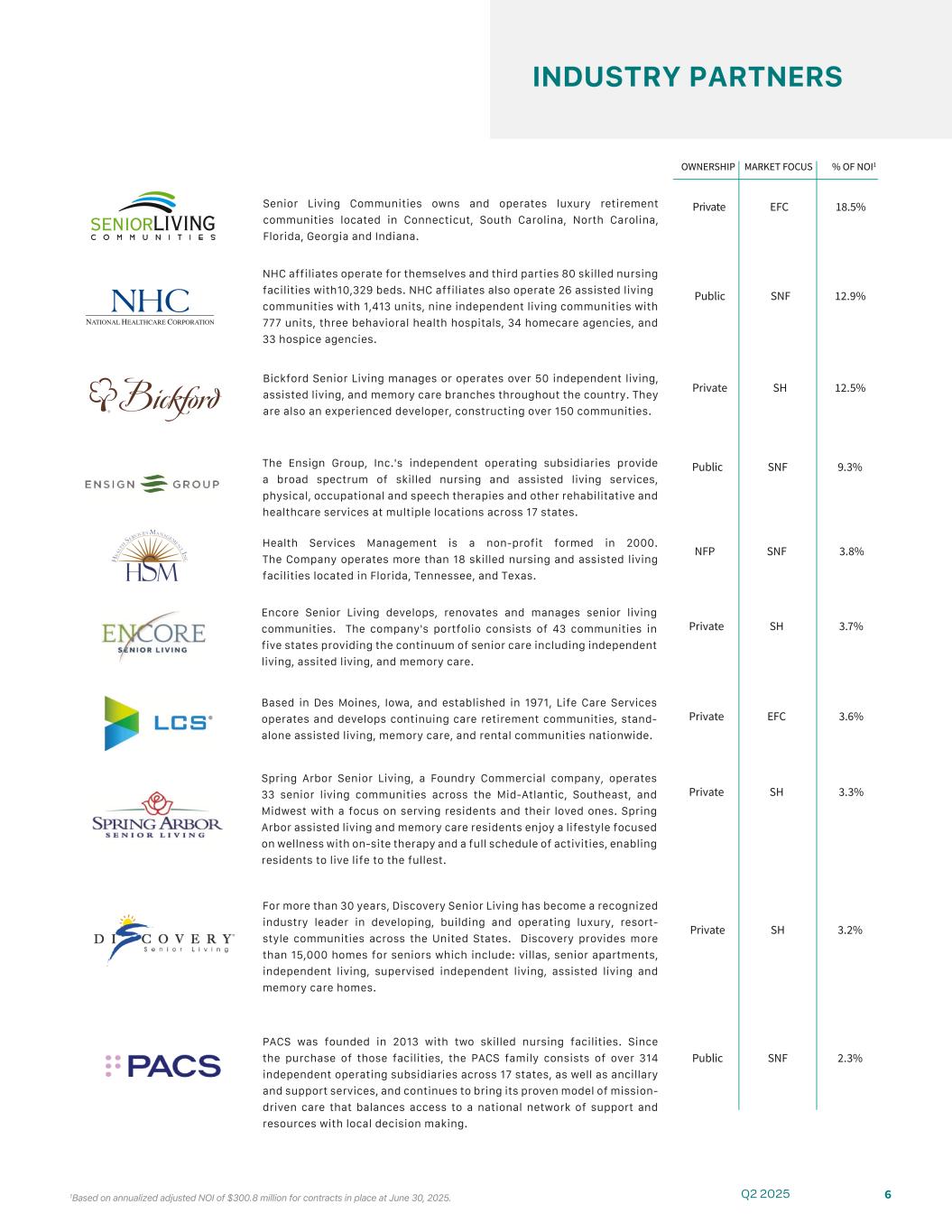 6Q2 2025 š– Œ›–”œ ”ž 1Based on annualized adjusted NOI of $300.8 million for contracts in place at June 30, 2025. INDUSTRY PARTNERS ƒ‡ Bickford Senior Living manages or operates over 50 independent living, assisted living, and memory care branches throughout the country. They are also an experienced developer, constructing over 150 communities. ‘Š ” ƒ‡ NHC affiliates operate for themselves and third parties 80 skilled nursing facilities with10,329 beds. NHC affiliates also operate 26 assisted living communities with 1,413 units, nine independent living communities with 777 units, three behavioral health hospitals, 34 homecare agencies, and 33 hospice agencies. –”œ ‡Senior Living Communities owns and operates luxury retirement communities located in Connecticut, South Carolina, North Carolina, Florida, Georgia and Indiana. ‘Š ” ‡€The Ensign Group, Inc.'s independent operating subsidiaries provide a broad spectrum of skilled nursing and assisted living services, physical, occupational and speech therapies and other rehabilitative and healthcare services at multiple locations across 17 states. ” ” €‡ Health Services Management is a non-profit formed in 2000. The Company operates more than 18 skilled nursing and assisted living facilities located in Florida, Tennessee, and Texas. –”œ €‡‰ Based in Des Moines, Iowa, and established in 1971, Life Care Services operates and develops continuing care retirement communities, stand- alone assisted living, memory care, and rental communities nationwide. €‡€ Spring Arbor Senior Living, a Foundry Commercial company, operates 33 senior living communities across the Mid-Atlantic, Southeast, and Midwest with a focus on serving residents and their loved ones. Spring Arbor assisted living and memory care residents enjoy a lifestyle focused on wellness with on-site therapy and a full schedule of activities, enabling residents to live life to the fullest. €‡ƒ For more than 30 years, Discovery Senior Living has become a recognized industry leader in developing, building and operating luxury, resort- style communities across the United States. Discovery provides more than 15,000 homes for seniors which include: villas, senior apartments, independent living, supervised independent living, assisted living and memory care homes. ‘Š ” ƒ‡€ PACS was founded in 2013 with two skilled nursing facilities. Since the purchase of those facilities, the PACS family consists of over 314 independent operating subsidiaries across 17 states, as well as ancillary and support services, and continues to bring its proven model of mission- driven care that balances access to a national network of support and resources with local decision making. €‡† Encore Senior Living develops, renovates and manages senior living communities. The company's portfolio consists of 43 communities in five states providing the continuum of senior care including independent living, assited living, and memory care.
