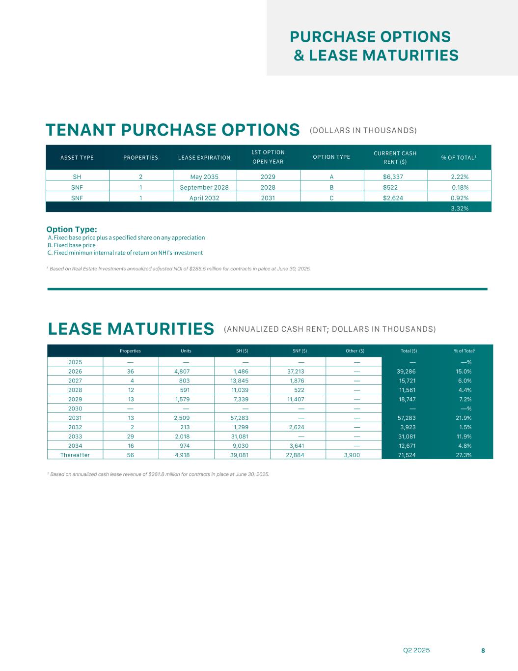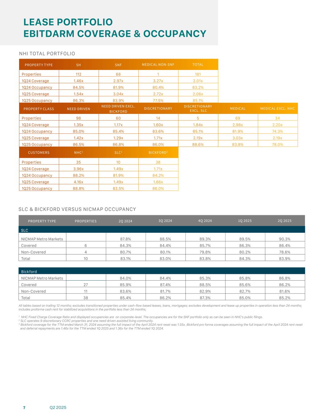 NHI TOTAL PORTFOLIO SLC & BICKFORD VERSUS NICMAP OCCUPANCY 1.54x LEASE PORTFOLIO EBITDARM COVERAGE & OCCUPANCY –••– ” Œ–œ“” Properties 112 68 1 181 1Q24 Coverage 1.46x 2.97x 3.27x 2.01x 1Q24 Occupancy 84.5% 81.9% 80.4% 83.2% 1Q25 Coverage 1.54x 3.04x 2.72x 2.06x 1Q25 Occupancy 86.3% 83.9% 77.5% 85.1% œŒ– œž œŸ ¡œ›”¢ Properties 35 10 38 1Q24 Coverage 3.96x 1.49x 1.71x 1Q24 Occupancy 88.2% 81.9% 84.2% 1Q25 Coverage 4.16x 1.49x 1.66x 1Q25 Occupancy 88.8% 83.5% 86.0% –•œ ––˜– ––˜––£œ‡ ¡œ›” œ–• œ–• –£œ‡œ Œ–œ Œ–œ–£œ‡ œ Properties 98 60 14 5 69 34 1Q24 Coverage 1.35x 1.17x 1.60x 1.84x 2.98x 2.20x 1Q24 Occupancy 85.0% 85.4% 83.6% 85.1% 81.9% 74.3% 1Q25 Coverage 1.42x 1.29x 1.71x 2.19x 3.03x 2.19x 1Q25 Occupancy 86.5% 86.8% 86.0% 88.6% 83.8% 78.0% –••– –– Ÿ’Ÿ¤Ÿ¥ ¢’Ÿ¤Ÿ¥ ¥’Ÿ¤Ÿ¥ ž’Ÿ¤Ÿ¦ Ÿ’Ÿ¤Ÿ¦ SLC NICMAP Metro Markets 87.8% 88.5% 89.3% 89.5% 90.3% Covered 6 84.3% 84.4% 85.7% 86.3% 86.4% Non-Covered 4 80.7% 80.1% 79.8% 80.2% 78.6% Total 10 83.1% 83.0% 83.8% 84.3% 83.9% Bickford NICMAP Metro Markets 84.0% 84.4% 85.3% 85.8% 86.8% Covered 27 85.9% 87.4% 88.5% 85.6% 86.2% Non-Covered 11 83.6% 81.7% 82.9% 82.7% 81.6% Total 38 85.4% 86.2% 87.3% 85.0% 85.2% All tables based on trailing 12 months; excludes transitioned properties under cash-flow based leases, loans, mortgages; excludes development and lease up properties in operation less than 24 months; includes proforma cash rent for stabilized acquisitions in the portfolio less than 24 months; 1 NHC Fixed Charge Coverage Ratio and displayed occupancies are on corporate-level. The occupancies are for the SNF portfolio only as can be seen in NHC's public filings. 2 SLC operates 9 discretionary CCRC properties and one need driven assisted living community. 3 Bickford coverage for the TTM ended March 31, 2024 assuming the full impact of the April 2024 rent reset was 1.55x. Bickford pro forma coverages assuming the full impact of the April 2024 rent reset and deferral repayments are 1.46x for the TTM ended 1Q 2025 and 1.36x for the TTM ended 1Q 2024. 7 Q2 2025