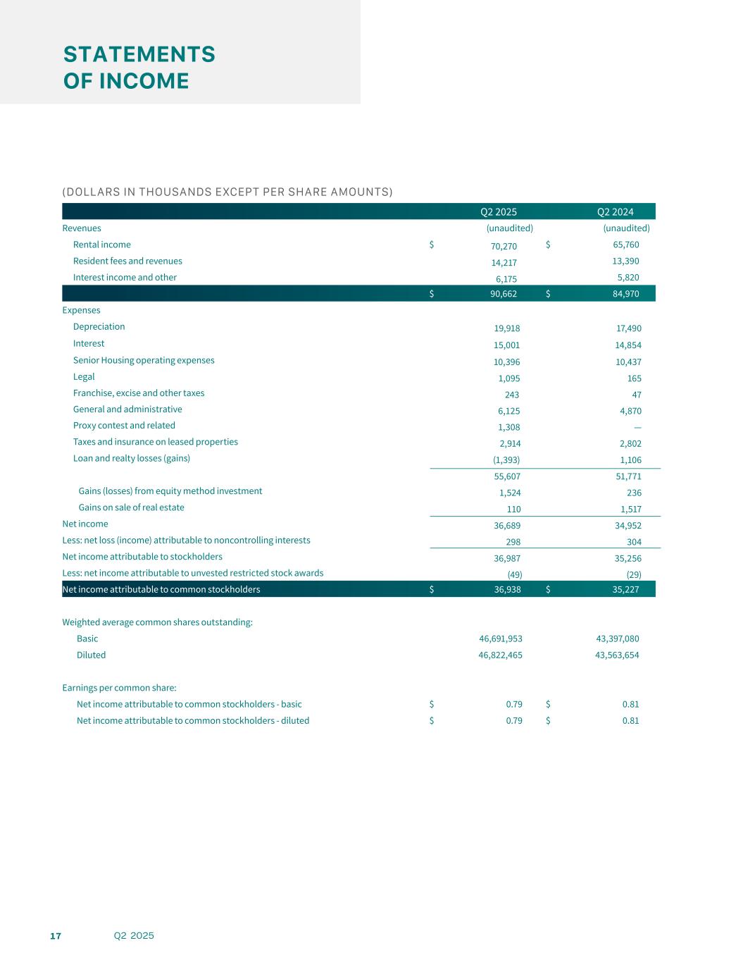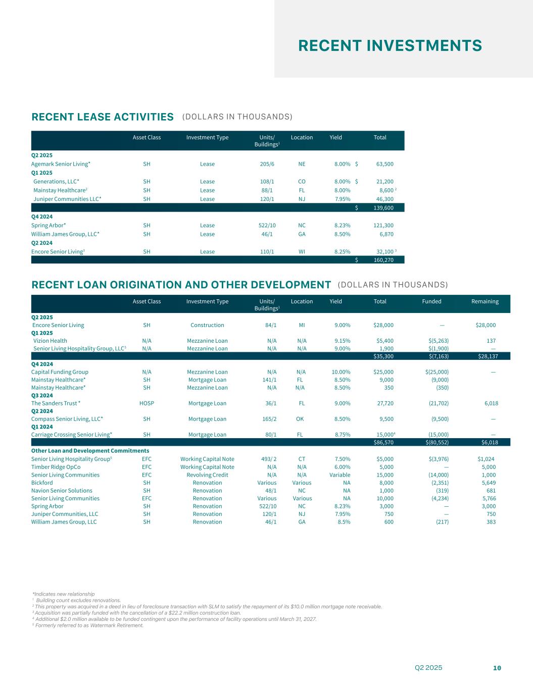 10Q2 2025 *Indicates new relationship 1 Building count excludes renovations. 2 This property was acquired in a deed in lieu of foreclosure transaction with SLM to satisfy the repayment of its $10.0 million mortgage note receivable. 3 Acquisition was partially funded with the cancellation of a $22.2 million construction loan. 4 Additional $2.0 million available to be funded contingent upon the performance of facility operations until March 31, 2027. 5 Formerly referred to as Watermark Retirement. œ ‹ ¨ ¡ Š • ” ˆ © ƒ…¨‰ – ‡…… ‚ ‰€ …… ‚ † ƒ…… ‚ ª « œ© …¨ œ ‡…… ‚ ƒ ƒ…… ‚ † ƒ…… ‚ ª Œ‹ ŽŠ ƒ ¨ ” ‡…… ‰…… ƒ ¬ œ œ© ƒ…¨ ¬ †‡ „‰ €…… ‚ € ‰…… ‚ „ …… ‚ ƒ †„ ‘© ƒƒ¨… œ ‡ƒ€ ƒ €…… 𬠫 œ© „‰¨ « ‡… ‰ †… –Š € …¨ š ‡ƒ €ƒ ……€ ‚ ‰… ƒ†… ‚ „ …… ‚ ƒ †„ œ ‹ ¨ ¡ Š • ” –Š œŠ „¨ Œ ‡…… ‚ƒ ……… ª ‚ƒ ……… ˜ Ž ¨ Œ ¨ ¨ ‡ ‚ „…… ‚ ƒ‰€ €† ‹« œ ¨ Œ ¨ ¨ ‡…… …… ‚ …… ª ‚€ €…… ‚† ‰€ ‚ƒ €† œ ”« ¨ Œ ¨ ¨ …‡…… ‚ƒ ……… ‚ƒ ……… ª Œ‹ ŽŠ © Œ „¨ ” ‡… ……… ……… Œ‹ ŽŠ © Œ ¨ ¨ ‡… €… €… Ž © Œ €‰¨ ” ‡…… ƒ† †ƒ… ƒ †…ƒ ‰ … œ œ© Œ ‰¨ƒ › ‡… …… …… ª œ œ © Œ …¨ ” ‡† ………® ……… ª ‚‰ †… ‚… ƒ ‚‰ … €‚ ‹« –”œ šˆœ „€¨ƒ œ †‡… ‚ ……… ‚€ †‰ ‚ …ƒ„ ‘ œ –”œ šˆœ ¨ ¨ ‰‡…… ……… ª ……… ª œ –”œ œ ¨ ¨ ˜‘ ……… „ ……… ……… ¡Šˆ ˜ ˜ ……… ƒ € ‰„ „¨ œ ……… € ‰ œ –”œ ˜ ˜ … ……… „ ƒ€„ †‰‰ ‘ ƒƒ¨… œ ‡ƒ€ € ……… ª € ……… ¬ œ œ ƒ…¨ ¬ †‡ †… ª †… 𬠫 œ „‰¨ « ‡ ‰…… ƒ† €€ RECENT INVESTMENTS RECENT LEASE ACTIVITIES (DOLLARS IN THOUSANDS) RECENT LOAN ORIGINATION AND OTHER DEVELOPMENT (DOLLARS IN THOUSANDS)