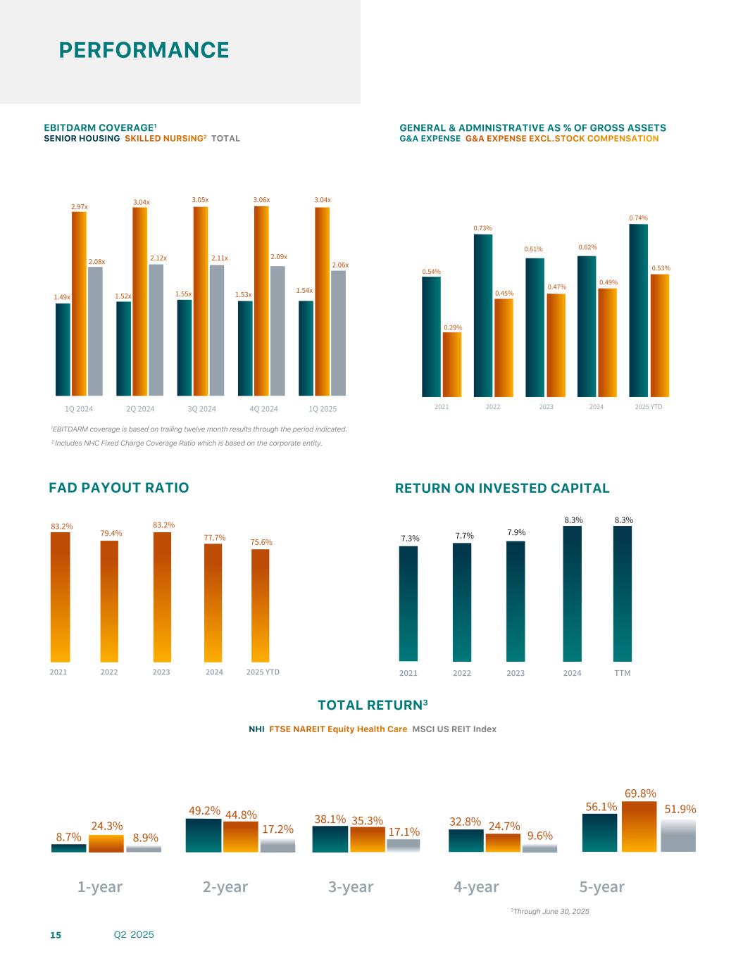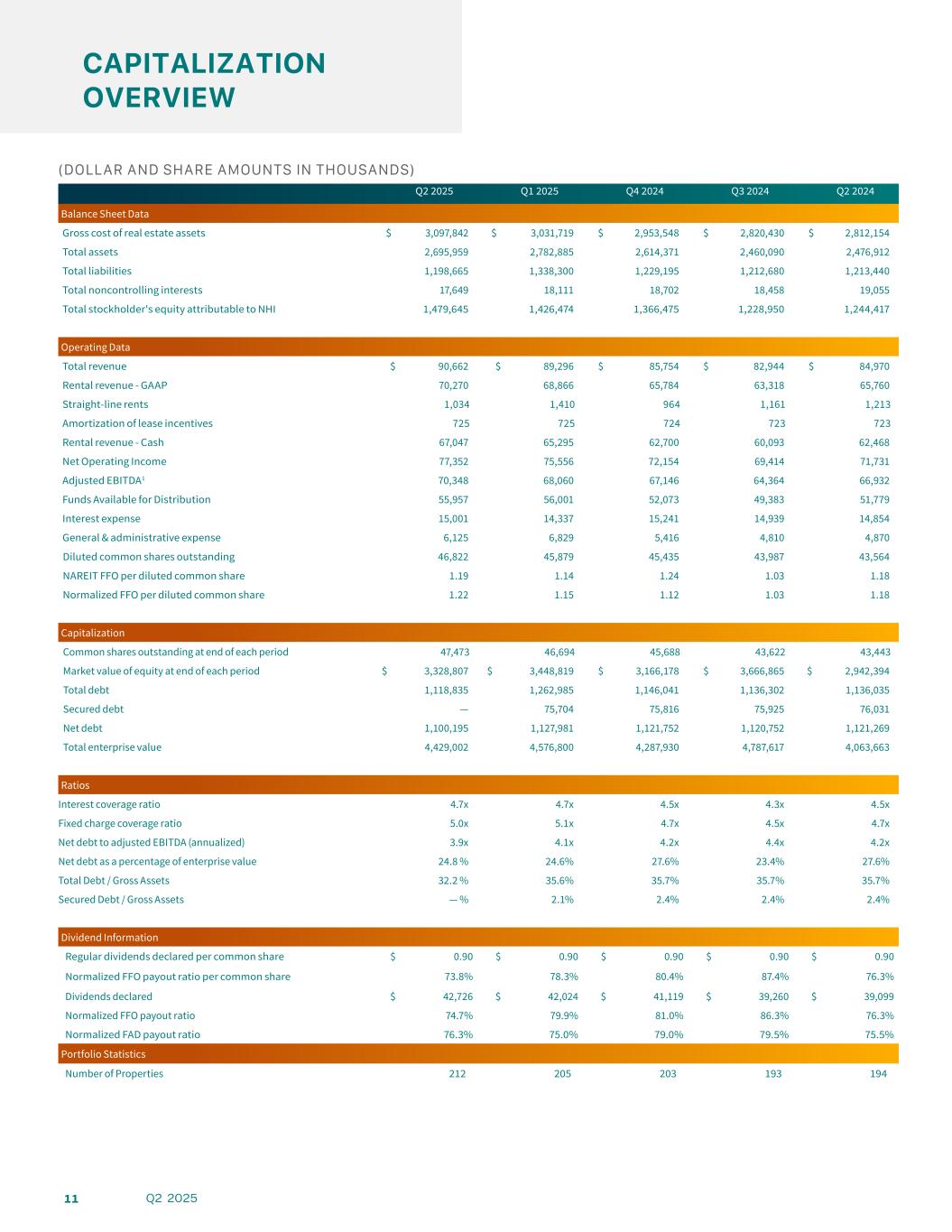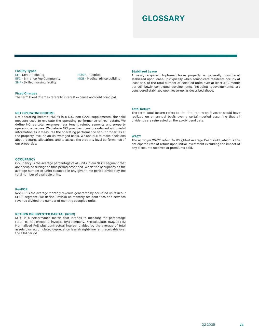 26Q2 2025 Stabilized Lease A newly acquired triple-net lease property is generally considered stabilized upon lease-up (typically when senior-care residents occupy at least 85% of the total number of certifi ed units over at least a 12 month period) Newly completed developments, including redevelopments, are considered stabilized upon lease-up, as described above. Total Return The term Total Return refers to the total return an investor would have realized on an annual basis over a certain period assuming that all dividends are reinvested on the ex-dividend date. WACY The acronym WACY refers to Weighted Average Cash Yield, which is the anticipated rate of return upon initial investment excluding the impact of any discounts received or premiums paid. Facility Types SH - Senior housing HOSP - Hospital EFC - Entrance Fee Community MOB - Medical offi ce building SNF - Skilled nursing facility Fixed Charges The term Fixed Charges refers to interest expense and debt principal. NET OPERATING INCOME Net operating income (“NOI”) is a U.S. non-GAAP supplemental fi nancial measure used to evaluate the operating performance of real estate. We defi ne NOI as total revenues, less tenant reimbursements and property operating expenses. We believe NOI provides investors relevant and useful information as it measures the operating performance of our properties at the property level on an unleveraged basis. We use NOI to make decisions about resource allocations and to assess the property level performance of our properties. OCCUPANCY Occupancy is the average percentage of all units in our SHOP segment that are occupied during the time period described. We defi ne occupancy as the average number of units occupied in any given time period divided by the total number of available units. RevPOR RevPOR is the average monthly revenue generated by occupied units in our SHOP segment. We defi ne RevPOR as monthly resident fees and services revenue divided the number of monthly occupied units. RETURN ON INVESTED CAPITAL (ROIC) ROIC is a performance metric that intends to measure the percentage return earned on capital invested by a company. NHI calculates ROIC as TTM Normalized FAD plus contractual interest divided by the average of total assets plus accumulated deprecation less straight-line rent receivable over the TTM period. GLOSSARY