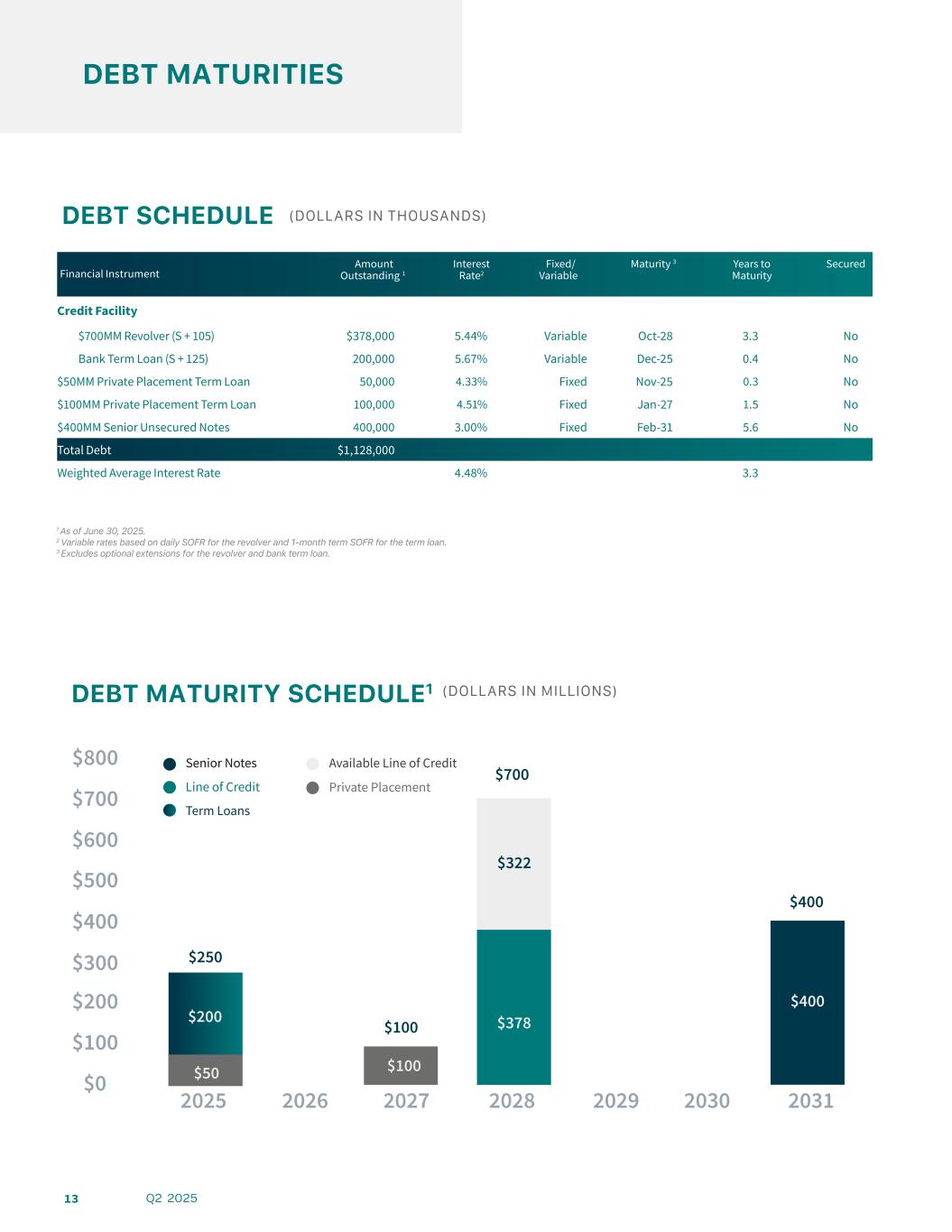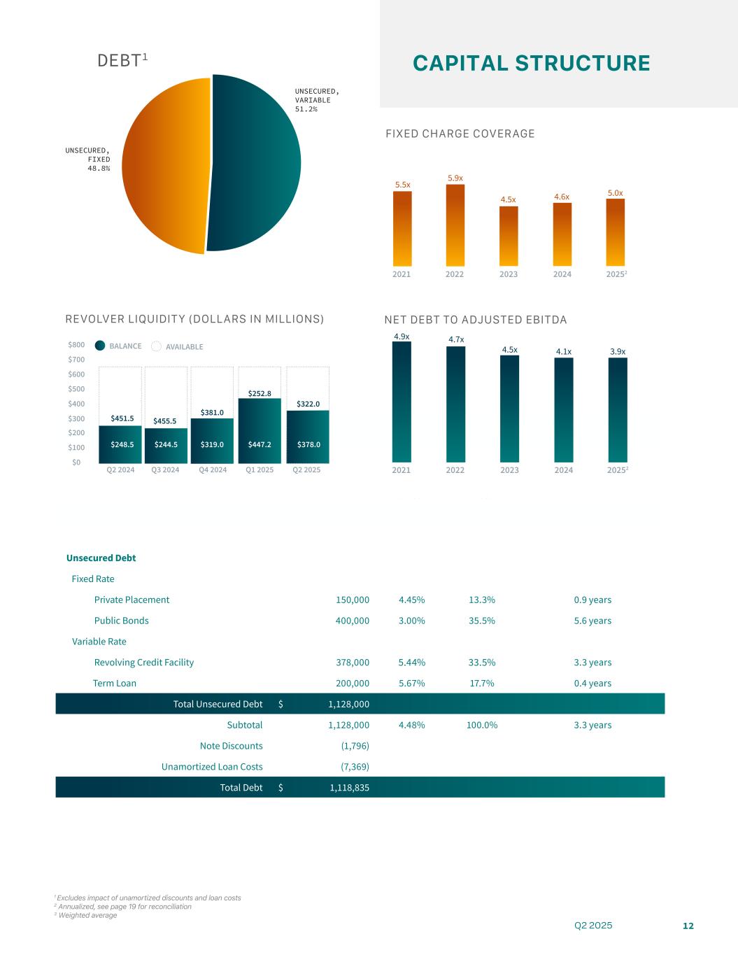 12Q2 2025 CAPITAL STRUCTURE NET DEBT TO ADJUSTED EBITDA 1 Excludes impact of unamortized discounts and loan costs 2 Annualized, see page 19 for reconciliation 3 Weighted average REVOLVER LIQUIDITY (DOLLARS IN MILLIONS) ŒŠŽ€ ƒ…ƒ„Ž Œ‹€ ƒ„… ”™ ” Œ Œ ‚ † †…„ €‡‰ ‰‡… …‹ Š ‘ ‚ † †…„ ‚ƒ„… ”™ Š … ……… „‡„ €‡€ …‡‹ ‘Š¡ „…… ……… €‡…… €‡ ‡‰‹ ˜‘ œ ”Š‹ €† ……… ‡„„ €€‡ €‡€‹ ƒ…… ……… ‡‰† †‡† …‡„‹ Š ‘ ‚ ƒ ……… ‘ ƒ ……… „‡„ ……‡… €‡€‹ Š †‰ œ † €‰ ‘ ‚ € UNSECURED, VARIABLE 51.2% UNSECURED, FIXED 48.8% DEBT1 Lease Notes unsecured, v FIXED CHARGE COVERAGE ’ƒƒ…ƒ ’ƒ…ƒ ’„ƒ…ƒ„ ’€ƒ…ƒ„ ’ƒƒ…ƒ„ ¡Š Ž «Š ‚ € …† „ƒ ‚ € …€ † ‚ ƒ € „ ‚ ƒ ƒ… „€… ‚ ƒ ƒ „ ƒ ‰ ƒ †ƒ ƒ ‰„ €† ƒ „‰… …… ƒ „†‰ ƒ ‘ ‰‰ €€ €…… ƒƒ ƒƒ ‰… ƒ€ „„… Š † ‰„ †…ƒ „ … ŠˆŽ § ¯‹‘‘ „† ‰„ „ƒ‰ „†„ €‰‰ „† ƒƒ … ƒ„„ „† ‚ … ‰‰ƒ ‚ ƒ‰ ‚ †„ ‚ ƒ „„ ‚ „ †… “« †… ƒ†… ‰ ‰‰ ‰ †„ ‰€ € ‰ †‰… Ž“ …€„ „… ‰„ ‰ ƒ€ Š †ƒ †ƒ †ƒ„ †ƒ€ †ƒ€ “œŽ ‰† …„† ‰ ƒ ‰ƒ †…… ‰… …€ ‰ƒ „‰ Š †† €ƒ † ‰ †ƒ „ ‰ „„ † †€ –¡ †… €„ ‰ …‰… ‰† „‰ ‰„ €‰„ ‰‰ €ƒ ”‘ ‘ † ‰ …… ƒ …†€ „ €€ †† ™ …… „ €€† ƒ„ „ € „ „ « ° ™ ‰ ƒ ‰ ƒ „‰ „ … „ †… ŠŽ „‰ ƒƒ „ † „ „€ „€ † „€ ‰„ –”” ŠŽ ‡ ‡„ ‡ƒ„ ‡…€ ‡ ”” ŠŽ ‡ƒƒ ‡ ‡ƒ ‡…€ ‡ œ œŽ ŠŽ „† „†€ „‰ ‰„ „ ‰ „€ ‰ƒƒ „€ „„€ Œˆ ¯‹ ŠŽ ‚ € €ƒ …† ‚ € „„ ‚ € ‰‰ † ‚ € ‰‰‰ ‰ ‚ ƒ „ƒ €„ ‘ € ƒ‰ƒ „‰ …„ €‰ €…ƒ €‰ …€ Š ‘ ª † †…„ † ‰ † ƒ †‰ …€ ‘ …… ƒ† ƒ †ƒ ƒ… †ƒ ƒ ƒ‰ „ „ƒ ……ƒ „ †‰ …… „ ƒ† €… „ †† ‰† „ …‰€ ‰‰€ Š „‡†™ „‡†™ „‡™ „‡€™ „‡™ ”™ ŠŽ Š ‡…™ ‡™ „‡†™ „‡™ „‡†™ ‘ –¡ €‡™ „‡™ „‡ƒ™ „‡„™ „‡ƒ™ ‘ Š ƒ„‡ ƒ„‡‰ ƒ†‡‰ ƒ€‡„ ƒ†‡‰ ‘¨« €ƒ‡ƒ €‡‰ €‡† €‡† €‡† Š ‘¨« ª ƒ‡ ƒ‡„ ƒ‡„ ƒ‡„ Š ŠŽ ‚ …‡… ‚ …‡… ‚ …‡… ‚ …‡… ‚ …‡… ”” ‹ ŠŽ †€‡ †‡€ …‡„ †‡„ †‰‡€ Š ‚ „ƒ †ƒ‰ ‚ „ƒ …ƒ„ ‚ „ ‚ € ƒ‰… ‚ € … ”” ‹ †„‡† †‡ ‡… ‰‡€ †‰‡€ ” ‹ †‰‡€ †‡… †‡… †‡ †‡ Š ‘ ƒƒ ƒ… ƒ…€ € „