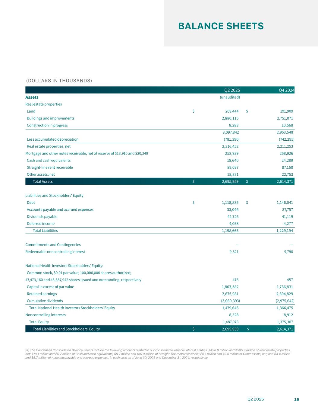 16Q2 2025 3Through June 30, 2025 BALANCE SHEETS (DOLLARS IN THOUSANDS) ’ƒƒ…ƒ ’„ƒ…ƒ„ ‚‚‚ ‚ ƒ… „„„ ‚ … ¡ ƒ … ƒ † …† œŠ ƒ€ … ‰ € …† „ƒ ƒ € „ ŠŠ Š † €… †„ƒ ƒ ƒ €‰ „ƒ ƒ ƒ ƒ€ Œ Ž Š ‘ ‚ …‚ƒ… ƒ„ ƒƒ € ƒ‰ ƒ‰ œŽŠŽ ¯ ‰„… ƒ„ ƒ Ž“ Š ‘ …† † … Ž € ƒƒ †€ ‚ ƒ ‰ ‚ ƒ ‰„ €† ‘ ŠˆŽ §–¯‹ ‘ ‚ € ‚ „‰ …„ ŠŠ ‹‘ ŠŠ ™ €€ …„‰ €† †† ‹‘ „ƒ †ƒ‰ „ Š „ … „ ƒ†† ‘ ‰‰ ƒƒ „ œ œ Š µ µ ‘ Š €ƒ †… Ž ŠˆŽ §–¯‹¶ œŠˆ ‚…‡… ·…… ……… ………Ž Ž · „† „†€ ‰…„ ‰† „ƒŽ Š ‹ „† „† œ ™Š ‰€ ƒ †€‰ € ƒ ‰† ƒ ‰…„ ƒ œ € …‰… €€ ƒ † ‰„ƒ Ž ŠˆŽ §–¯‹ „† ‰„ €‰‰ „† Š €ƒ ƒ –¯‹ „† †€ €† €† ‘ ŠˆŽ §–¯‹ ‚ ƒ ‰ ‚ ƒ ‰„ €† (a) The Condensed Consolidated Balance Sheets include the following amounts related to our consolidated variable interest entities: $498.8 million and $505.9 million of Real estate properties, net; $10.1 million and $9.7 million of Cash and cash equivalents; $9.7 million and $10.0 million of Straight-line rents receivable; $6.1 million and $7.5 million of Other assets, net; and $4.4 million and $5.7 million of Accounts payable and accrued expenses, in each case as of June 30, 2025 and December 31, 2024, respectively.