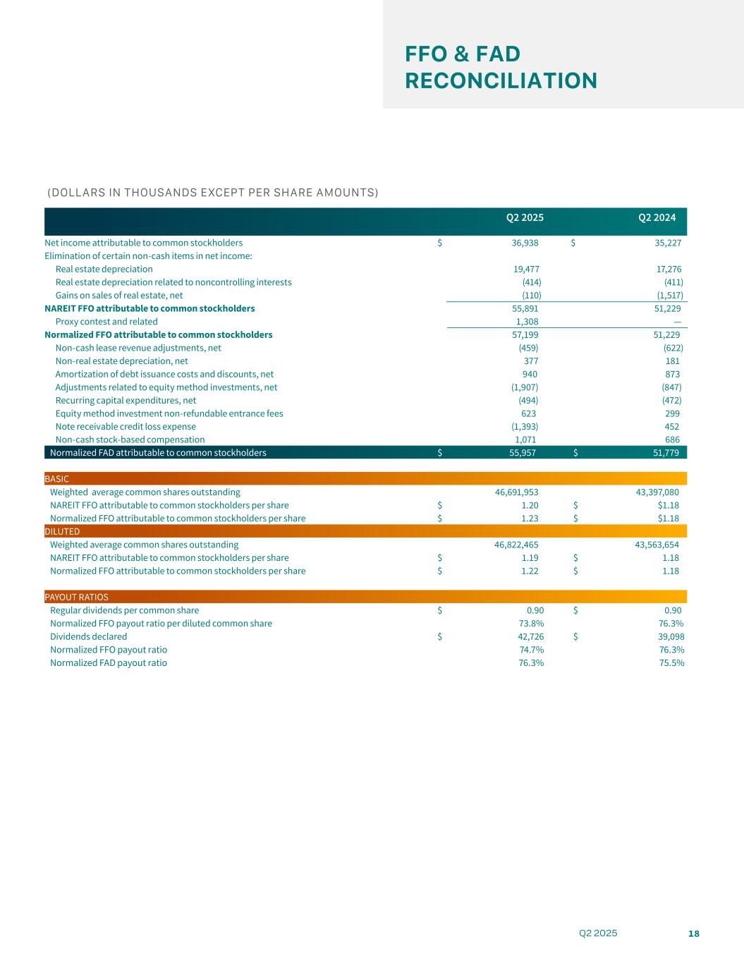 18Q2 2025 FFO & FAD RECONCILIATION (DOLLARS IN THOUSANDS EXCEPT PER SHARE AMOUNTS) Š ‘‘ ŠŠˆŽ ‚ €‰ € ‚ € ƒƒ† –Š “ŠŽ Š ¶ Š „†† † ƒ†‰ Š Š „„ „ « … † ††€…„…ƒ‚ƒˆ‚ ƒƒ ™‹Š €… ª €‰††€…„…ƒ‚ƒˆ‚ † ƒƒ “ŠŽ „ ‰ƒƒ “ Š €†† ‘Š ŠŠ „… †€ ¯‹ Ž …† „† ŠŠ ™ „„ „†ƒ –¯‹ Ž “ ‘ Š ‰ƒ€ ƒ Š ‘ Š ™ €€ „ƒ “ŠŽŠˆ“‘ Š …† ‰‰ ”‘‘ ŠŠˆŽ ‚ † ‚ †† ¡œ š Ž ŠŽ „‰ ‰ € „€ €† …… –””‘‘ ŠŠˆŽ Ž ‚ ‡ƒ… ‚ ‚‡ ””‘‘ ŠŠˆŽ Ž ‚ ‡ƒ€ ‚ ‚‡ – š Ž ŠŽ „‰ ƒƒ „‰ „€ ‰€ ‰„ –””‘‘ ŠŠˆŽ Ž ‚ ‡ ‚ ‡ ””‘‘ ŠŠˆŽ Ž ‚ ‡ƒƒ ‚ ‡ • ŠŽ ‚ …‡… ‚ …‡… ”” ‹ ŠŽ †€‡ †‰‡€ Š ‚ „ƒ †ƒ‰ ‚ € … ”” ‹ †„‡† †‰‡€ ” ‹ †‰‡€ †‡