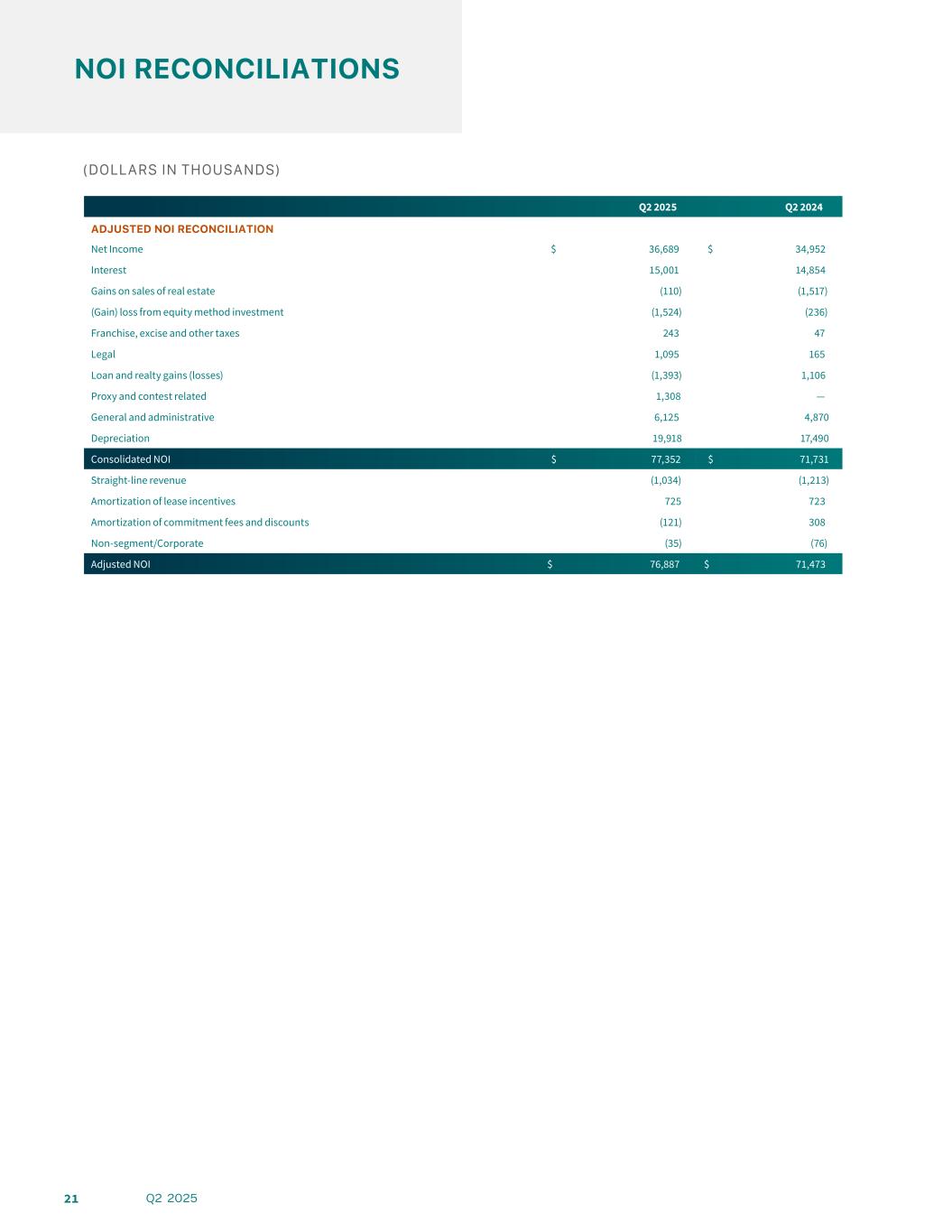 20Q2 2025 NOI RECONCILIATIONS NOI SEGMENT RECONCILIATION “ Š ‚ „„ „ ‚ € ‰„ ˆ ƒ „‰ ƒ… „‰ …† …ƒƒ €…… ƒ †‰ “ ‚ ‰† €‰ ‚ ‰ƒ ” „ ƒ† € €… ™ … €‰ … „€† € ƒ ƒ € Š Ž ‰ † ƒ… ‚ †† €ƒ ‚ † †€ NOI TO ADJUSTED NOI RECONCILIATION Ž“ …€„ ƒ€ Š †ƒ †ƒ€ Š Š ƒ €… “ ¨œ € †‰ ‚ †‰ † ‚ † „†€ (DOLLARS IN THOUSANDS)