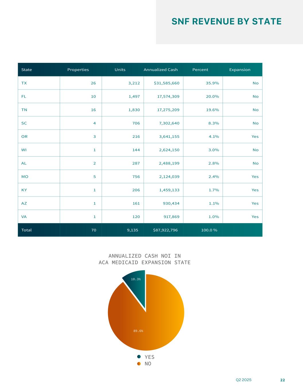 22Q2 2025 SNF REVENUE BY STATE œŽ Š –™ £ ƒ‰ € ƒƒ ‚€ ‰‰… €‡ ” … „† † †„ €… ƒ…‡… ‰ €… † ƒ† ƒ… ‡‰ œ „ †…‰ † €…ƒ ‰„… ‡€ € ƒ‰ € ‰„ „‡ • š „„ ƒ ‰ƒ„ … €‡… ƒ ƒ† ƒ „ ƒ‡ Œ †‰ ƒ ƒ„ …€ ƒ‡„ • ›• ƒ…‰ „ €€ ‡† • ¹ ‰ €… „€„ ‡ • ˜ ƒ… † ‰ ‡… • †… € ‚† ƒƒ †‰ ……‡… ANNUALIZED CASH NOI IN ACA MEDICAID EXPANSION STATE YES NO Lease Notes unsecured, v 10.3% 89.6%
