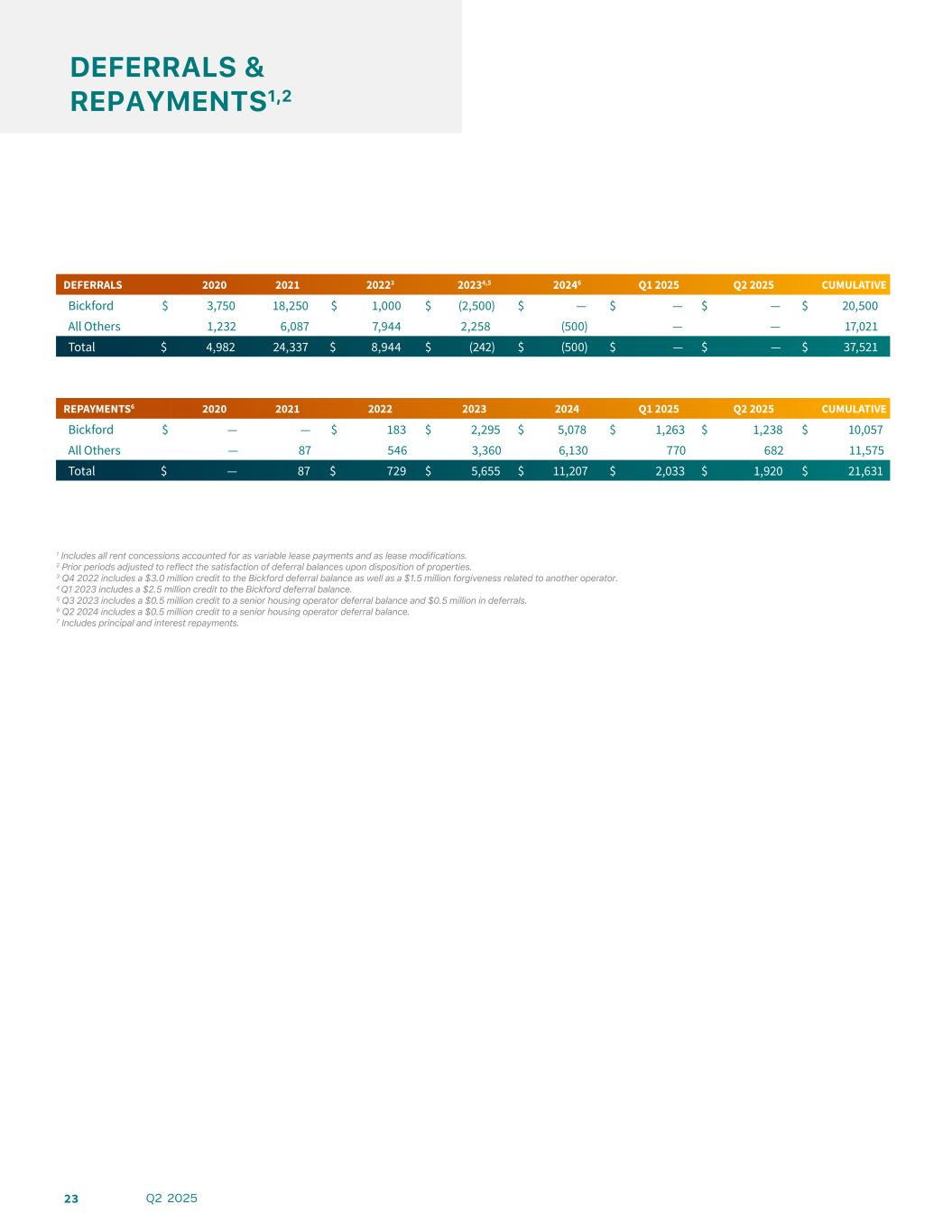 23 Q2 2025 1 Includes all rent concessions accounted for as variable lease payments and as lease modifications. 2 Prior periods adjusted to reflect the satisfaction of deferral balances upon disposition of properties. 3 Q4 2022 includes a $3.0 million credit to the Bickford deferral balance as well as a $1.5 million forgiveness related to another operator. 4 Q1 2023 includes a $2.5 million credit to the Bickford deferral balance. 5 Q3 2023 includes a $0.5 million credit to a senior housing operator deferral balance and $0.5 million in deferrals. 6 Q2 2024 includes a $0.5 million credit to a senior housing operator deferral balance. 7 Includes principal and interest repayments. DEFERRALS & REPAYMENTS1,2 † Š‹ŠŠŒ Š‹ŠŽ‘’“ ЋБ” •ЋГ ŠŠ‹Š“ – — ¡Šˆ ‚ € †… ƒ… ‚ ……… ‚ ƒ …… ‚ ª ‚ ª ‚ ª ‚ ƒ… …… Ž ƒ€ƒ ‰ …† † „„ ƒ ƒ …… ª ª † …ƒ ‚ „ ƒ ƒ„ €€† ‚ „„ ‚ ƒ„ƒ ‚ …… ‚ ª ‚ ª ‚ €† ƒ – ˜ Š‹ŠŠ Š‹ŠŽ ЋБ •ЋГ ŠŠ‹Š“ – — ¡Šˆ ‚ ª ª ‚ € ‚ ƒ ƒ ‚ …† ‚ ƒ‰€ ‚ ƒ€ ‚ … …† Ž ª † „‰ € €‰… ‰ €… ††… ‰ƒ † ‚ ª † ‚ †ƒ ‚ ‰ ‚ ƒ…† ‚ ƒ …€€ ‚ ƒ… ‚ ƒ ‰€