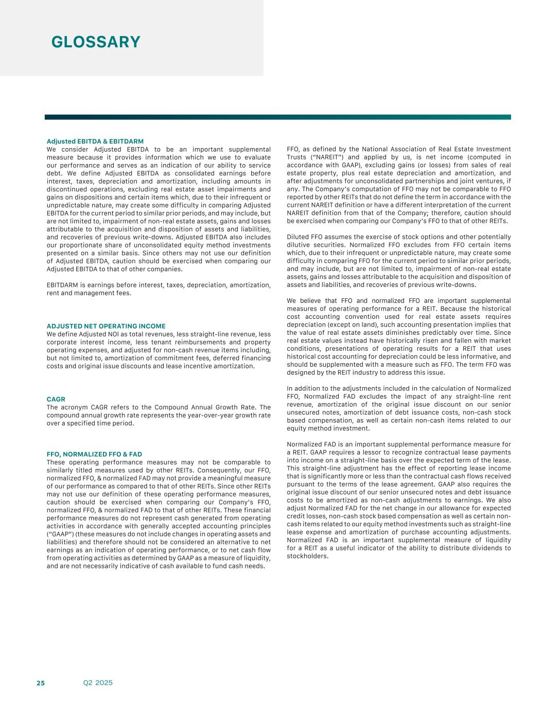 25 Q2 2025 GLOSSARY Adjusted EBITDA & EBITDARM We consider Adjusted EBITDA to be an important supplemental measure because it provides information which we use to evaluate our performance and serves as an indication of our ability to service debt. We defi ne Adjusted EBITDA as consolidated earnings before interest, taxes, depreciation and amortization, including amounts in discontinued operations, excluding real estate asset impairments and gains on dispositions and certain items which, due to their infrequent or unpredictable nature, may create some diffi culty in comparing Adjusted EBITDA for the current period to similar prior periods, and may include, but are not limited to, impairment of non-real estate assets, gains and losses attributable to the acquisition and disposition of assets and liabilities, and recoveries of previous write-downs. Adjusted EBITDA also includes our proportionate share of unconsolidated equity method investments presented on a similar basis. Since others may not use our defi nition of Adjusted EBITDA, caution should be exercised when comparing our Adjusted EBITDA to that of other companies. EBITDARM is earnings before interest, taxes, depreciation, amortization, rent and management fees. ADJUSTED NET OPERATING INCOME We defi ne Adjusted NOI as total revenues, less straight-line revenue, less corporate interest income, less tenant reimbursements and property operating expenses, and adjusted for non-cash revenue items including, but not limited to, amortization of commitment fees, deferred fi nancing costs and original issue discounts and lease incentive amortization. CAGR The acronym CAGR refers to the Compound Annual Growth Rate. The compound annual growth rate represents the year-over-year growth rate over a specifi ed time period. FFO, NORMALIZED FFO & FAD These operating performance measures may not be comparable to similarly titled measures used by other REITs. Consequently, our FFO, normalized FFO, & normalized FAD may not provide a meaningful measure of our performance as compared to that of other REITs. Since other REITs may not use our defi nition of these operating performance measures, caution should be exercised when comparing our Company’s FFO, normalized FFO, & normalized FAD to that of other REITs. These fi nancial performance measures do not represent cash generated from operating activities in accordance with generally accepted accounting principles (“GAAP”) (these measures do not include changes in operating assets and liabilities) and therefore should not be considered an alternative to net earnings as an indication of operating performance, or to net cash fl ow from operating activities as determined by GAAP as a measure of liquidity, and are not necessarily indicative of cash available to fund cash needs. FFO, as defi ned by the National Association of Real Estate Investment Trusts (“NAREIT”) and applied by us, is net income (computed in accordance with GAAP), excluding gains (or losses) from sales of real estate property, plus real estate depreciation and amortization, and after adjustments for unconsolidated partnerships and joint ventures, if any. The Company’s computation of FFO may not be comparable to FFO reported by other REITs that do not defi ne the term in accordance with the current NAREIT defi nition or have a different interpretation of the current NAREIT defi nition from that of the Company; therefore, caution should be exercised when comparing our Company’s FFO to that of other REITs. Diluted FFO assumes the exercise of stock options and other potentially dilutive securities. Normalized FFO excludes from FFO certain items which, due to their infrequent or unpredictable nature, may create some diffi culty in comparing FFO for the current period to similar prior periods, and may include, but are not limited to, impairment of non-real estate assets, gains and losses attributable to the acquisition and disposition of assets and liabilities, and recoveries of previous write-downs. We believe that FFO and normalized FFO are important supplemental measures of operating performance for a REIT. Because the historical cost accounting convention used for real estate assets requires depreciation (except on land), such accounting presentation implies that the value of real estate assets diminishes predictably over time. Since real estate values instead have historically risen and fallen with market conditions, presentations of operating results for a REIT that uses historical cost accounting for depreciation could be less informative, and should be supplemented with a measure such as FFO. The term FFO was designed by the REIT industry to address this issue. In addition to the adjustments included in the calculation of Normalized FFO, Normalized FAD excludes the impact of any straight-line rent revenue, amortization of the original issue discount on our senior unsecured notes, amortization of debt issuance costs, non-cash stock based compensation, as well as certain non-cash items related to our equity method investment. Normalized FAD is an important supplemental performance measure for a REIT. GAAP requires a lessor to recognize contractual lease payments into income on a straight-line basis over the expected term of the lease. This straight-line adjustment has the effect of reporting lease income that is signifi cantly more or less than the contractual cash fl ows received pursuant to the terms of the lease agreement. GAAP also requires the original issue discount of our senior unsecured notes and debt issuance costs to be amortized as non-cash adjustments to earnings. We also adjust Normalized FAD for the net change in our allowance for expected credit losses, non-cash stock based compensation as well as certain non- cash items related to our equity method investments such as straight-line lease expense and amortization of purchase accounting adjustments. Normalized FAD is an important supplemental measure of liquidity 
