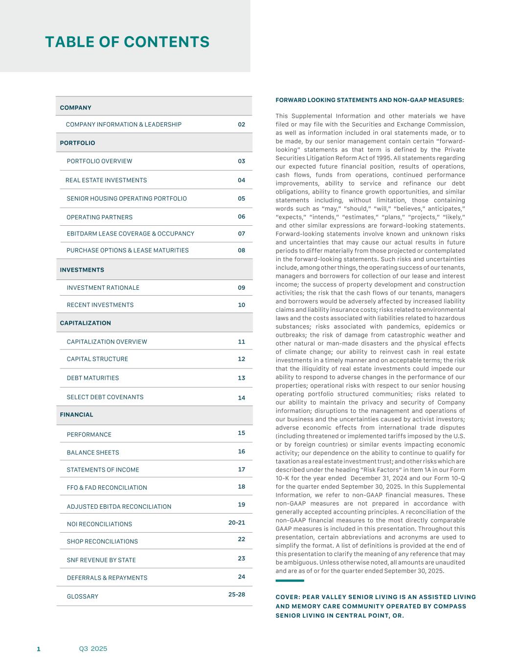 TABLE OF CONTENTS 1 Q3 2025 COVER: PEAR VALLEY SENIOR LIVING IS AN ASSISTED LIVING AND MEMORY CARE COMMUNITY OPERATED BY COMPASS SENIOR LIVING IN CENTRAL POINT, OR. FORWARD LOOKING STATEMENTS AND NON-GAAP MEASURES: This Supplemental Information and other materials we have filed or may file with the Securities and Exchange Commission, as well as information included in oral statements made, or to be made, by our senior management contain certain “forward- looking” statements as that term is defined by the Private Securities Litigation Reform Act of 1995. All statements regarding our expected future financial position, results of operations, cash flows, funds from operations, continued performance improvements, ability to service and refinance our debt obligations, ability to finance growth opportunities, and similar statements including, without limitation, those containing words such as “may,” “should,” “will,” “believes,” anticipates,” “expects,” “intends,” “estimates,” “plans,” “projects,” “likely,” and other similar expressions are forward-looking statements. Forward-looking statements involve known and unknown risks and uncertainties that may cause our actual results in future periods to differ materially from those projected or contemplated in the forward-looking statements. Such risks and uncertainties include, among other things, the operating success of our tenants, managers and borrowers for collection of our lease and interest income; the success of property development and construction activities; the risk that the cash flows of our tenants, managers and borrowers would be adversely affected by increased liability claims and liability insurance costs; risks related to environmental laws and the costs associated with liabilities related to hazardous substances; risks associated with pandemics, epidemics or outbreaks; the risk of damage from catastrophic weather and other natural or man-made disasters and the physical effects of climate change; our ability to reinvest cash in real estate investments in a timely manner and on acceptable terms; the risk that the illiquidity of real estate investments could impede our ability to respond to adverse changes in the performance of our properties; operational risks with respect to our senior housing operating portfolio structured communities; risks related to our ability to maintain the privacy and security of Company information; disruptions to the management and operations of our business and the uncertainties caused by activist investors; adverse economic effects from international trade disputes (including threatened or implemented tariffs imposed by the U.S. or by foreign countries) or similar events impacting economic activity; our dependence on the ability to continue to qualify for taxation as a real estate investment trust; and other risks which are described under the heading “Risk Factors” in Item 1A in our Form 10-K for the year ended December 31, 2024 and our Form 10-Q for the quarter ended September 30, 2025. In this Supplemental Information, we refer to non-GAAP financial measures. These non-GAAP measures are not prepared in accordance with generally accepted accounting principles. A reconciliation of the non-GAAP financial measures to the most directly comparable GAAP measures is included in this presentation. Throughout this presentation, certain abbreviations and acronyms are used to simplify the format. A list of definitions is provided at the end of this presentation to clarify the meaning of any reference that may be ambiguous. Unless otherwise noted, all amounts are unaudited and are as of or for the quarter ended September 30, 2025. COMPANY COMPANY INFORMATION & LEADERSHIP PORTFOLIO PORTFOLIO OVERVIEW REAL ESTATE INVESTMENTS SENIOR HOUSING OPERATING PORTFOLIO EBITDARM LEASE COVERAGE & OCCUPANCY PURCHASE OPTIONS & LEASE MATURITIES INVESTMENTS INVESTMENT RATIONALE RECENT INVESTMENTS CAPITALIZATION 10 CAPITALIZATION OVERVIEW CAPITAL STRUCTURE DEBT MATURITIES NOI RECONCILIATIONS SHOP RECONCILIATIONS SNF REVENUE BY STATE DEFERRALS & REPAYMENTS GLOSSARY SELECT DEBT COVENANTS FINANCIAL PERFORMANCE BALANCE SHEETS STATEMENTS OF INCOME ADJUSTED EBITDA RECONCILIATION FFO & FAD RECONCILIATION OPERATING PARTNERS 02 03 04 05 07 08 09 11 12 13 14 15 16 17 18 19 20-21 22 23 24 25-28 06