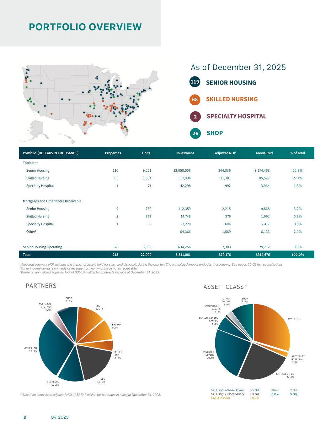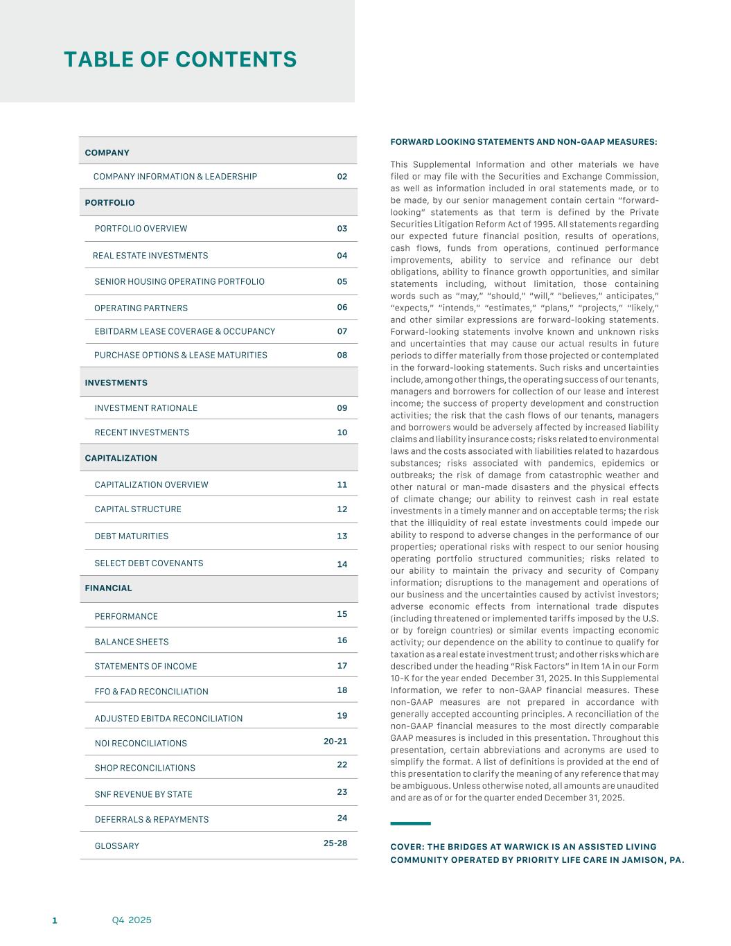 TABLE OF CONTENTS 1 Q4 2025 COVER: THE BRIDGES AT WARWICK IS AN ASSISTED LIVING COMMUNITY OPERATED BY PRIORITY LIFE CARE IN JAMISON, PA. FORWARD LOOKING STATEMENTS AND NON-GAAP MEASURES: This Supplemental Information and other materials we have filed or may file with the Securities and Exchange Commission, as well as information included in oral statements made, or to be made, by our senior management contain certain “forward- looking” statements as that term is defined by the Private Securities Litigation Reform Act of 1995. All statements regarding our expected future financial position, results of operations, cash flows, funds from operations, continued performance improvements, ability to service and refinance our debt obligations, ability to finance growth opportunities, and similar statements including, without limitation, those containing words such as “may,” “should,” “will,” “believes,” anticipates,” “expects,” “intends,” “estimates,” “plans,” “projects,” “likely,” and other similar expressions are forward-looking statements. Forward-looking statements involve known and unknown risks and uncertainties that may cause our actual results in future periods to differ materially from those projected or contemplated in the forward-looking statements. Such risks and uncertainties include, among other things, the operating success of our tenants, managers and borrowers for collection of our lease and interest income; the success of property development and construction activities; the risk that the cash flows of our tenants, managers and borrowers would be adversely affected by increased liability claims and liability insurance costs; risks related to environmental laws and the costs associated with liabilities related to hazardous substances; risks associated with pandemics, epidemics or outbreaks; the risk of damage from catastrophic weather and other natural or man-made disasters and the physical effects of climate change; our ability to reinvest cash in real estate investments in a timely manner and on acceptable terms; the risk that the illiquidity of real estate investments could impede our ability to respond to adverse changes in the performance of our properties; operational risks with respect to our senior housing operating portfolio structured communities; risks related to our ability to maintain the privacy and security of Company information; disruptions to the management and operations of our business and the uncertainties caused by activist investors; adverse economic effects from international trade disputes (including threatened or implemented tariffs imposed by the U.S. or by foreign countries) or similar events impacting economic activity; our dependence on the ability to continue to qualify for taxation as a real estate investment trust; and other risks which are described under the heading “Risk Factors” in Item 1A in our Form 10-K for the year ended December 31, 2025. In this Supplemental Information, we refer to non-GAAP financial measures. These non-GAAP measures are not prepared in accordance with generally accepted accounting principles. A reconciliation of the non-GAAP financial measures to the most directly comparable GAAP measures is included in this presentation. Throughout this presentation, certain abbreviations and acronyms are used to simplify the format. A list of definitions is provided at the end of this presentation to clarify the meaning of any reference that may be ambiguous. Unless otherwise noted, all amounts are unaudited and are as of or for the quarter ended December 31, 2025. COMPANY COMPANY INFORMATION & LEADERSHIP PORTFOLIO PORTFOLIO OVERVIEW REAL ESTATE INVESTMENTS SENIOR HOUSING OPERATING PORTFOLIO EBITDARM LEASE COVERAGE & OCCUPANCY PURCHASE OPTIONS & LEASE MATURITIES INVESTMENTS INVESTMENT RATIONALE RECENT INVESTMENTS CAPITALIZATION 10 CAPITALIZATION OVERVIEW CAPITAL STRUCTURE DEBT MATURITIES NOI RECONCILIATIONS SHOP RECONCILIATIONS SNF REVENUE BY STATE DEFERRALS & REPAYMENTS GLOSSARY SELECT DEBT COVENANTS FINANCIAL PERFORMANCE BALANCE SHEETS STATEMENTS OF INCOME ADJUSTED EBITDA RECONCILIATION FFO & FAD RECONCILIATION OPERATING PARTNERS 02 03 04 05 07 08 09 11 12 13 14 15 16 17 18 19 20-21 22 23 24 25-28 06
