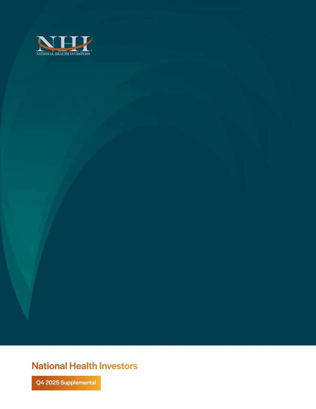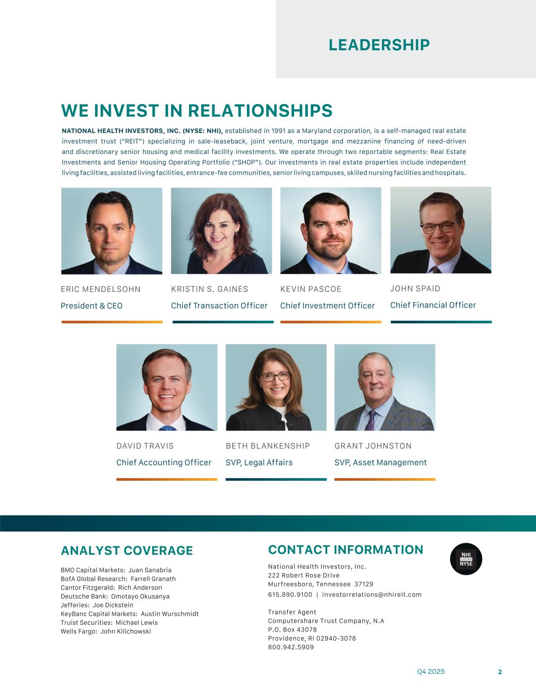 2Q4 2025 WE INVEST IN RELATIONSHIPS KRISTIN S. GAINES Chief Transaction Offi cer KEVIN PASCOE Chief Investment Offi cer JOHN SPAID Chief Financial Offi cer ERIC MENDELSOHN President & CEO DAVID TRAVIS Chief Accounting Offi cer GRANT JOHNSTON SVP, Asset Management BETH BLANKENSHIP SVP, Legal Affairs ANALYST COVERAGE BMO Capital Markets: Juan Sanabria BofA Global Research: Farrell Granath Cantor Fitzgerald: Rich Anderson Deutsche Bank: Omotayo Okusanya Jefferies: Joe Dickstein KeyBanc Capital Markets: Austin Wurschmidt Truist Securities: Michael Lewis Wells Fargo: John Kilichowski CONTACT INFORMATION National Health Investors, Inc. 222 Robert Rose Drive Murfreesboro, Tennessee 37129 615.890.9100 | investorrelations@nhireit.com Transfer Agent Computershare Trust Company, N.A P.O. Box 43078 Providence, RI 02940-3078 800.942.5909 NATIONAL HEALTH INVESTORS, INC. (NYSE: NHI), established in 1991 as a Maryland corporation, is a self-managed real estate investment trust (“REIT”) specializing in sale-leaseback, joint venture, mortgage and mezzanine fi nancing of need-driven and discretionary senior housing and medical facility investments. We operate through two reportable segments: Real Estate Investments and Senior Housing Operating Portfolio (“SHOP”). Our investments in real estate properties include independent living facilities, assisted living facilities, entrance-fee communities, senior living campuses, skilled nursing facilities and hospitals. LEADERSHIP