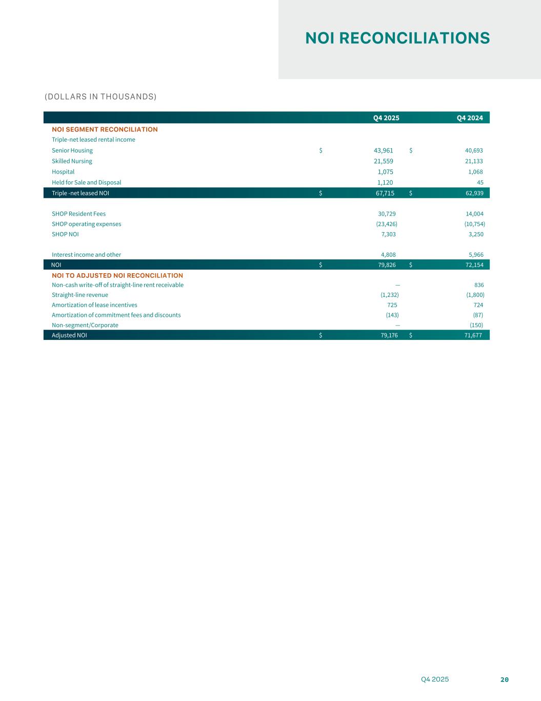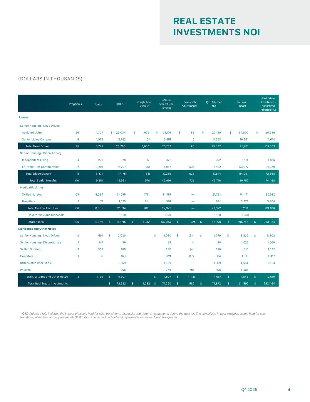 4Q4 2025 “ Ž Ž ”ŠŽ “ •– Š — Leases Senior Housing - Need Driven Assisted Living 86 4,704 $ 23,034 $ 933 $ 22,101 $ 88 $ 22,189 $ 64,800 $ 86,989 Senior Living Campus 9 1,073 3,752 101 3,651 2 3,653 10,961 14,614 Total Need Driven 95 5,777 26,786 1,034 25,752 90 25,842 75,761 101,603 Senior Housing - Discretionary Independent Living 3 273 378 6 372 — 372 1,114 1,486 Entrance-Fee Communities 12 3,201 16,797 (70) 16,867 635 17,502 53,877 71,379 Total Discretionary 15 3,474 17,175 (64) 17,239 635 17,874 54,991 72,865 Total Senior Housing 110 9,251 43,961 970 42,991 725 43,716 130,752 174,468 Medical Facilities Skilled Nursing 65 8,534 21,559 178 21,381 — 21,381 64,141 85,522 Hospitals 1 71 1,075 84 991 — 991 2,973 3,964 Total Medical Facilities 66 8,605 22,634 262 22,372 — 22,372 67,114 89,486 Held for Sale and Disposals- 1,120 — 1,120 — 1,120 (1,120) — Total Leases 176 17,856 $ 67,715 $ 1,232 66,483 $ 725 $ 67,208 $ 196,746 $ 263,954 Mortgages and Other Notes Senior Housing - Need Driven 8 591 $ 2,030 $ 2,030 $ (51) $ 1,979 $ 6,829 $ 8,808 Senior Housing - Discretionary 1 141 39 39 (1) 38 1,022 1,060 Skilled Nursing 3 367 280 280 (4) 276 816 1,092 Hospitals 1 36 621 621 (17) 604 1,813 2,417 Other Notes Receivable 1,569 1,569 — 1,569 4,564 6,133 Payoffs 268 268 (70) 198 (198) — Total Mortgage and Other Notes 13 1,135 $ 4,807 $ 4,807 $ (143) 4,664 $ 14,846 $ 19,510 Total Real Estate Investments $ 72,522 $ 1,232 $ 71,290 $ 582 $ 71,872 $ 211,592 $ 283,464 * QTD Adjusted NOI includes the impact of assets held for sale, transitions, disposals, and deferral repayments during the quarter. The annualized impact excludes assets held for sale, transtions, disposals, and approximately $1.6 million in unscheduled deferral repayments received during the quarter. REAL ESTATE INVESTMENTS NOI (DOLLARS IN THOUSANDS)