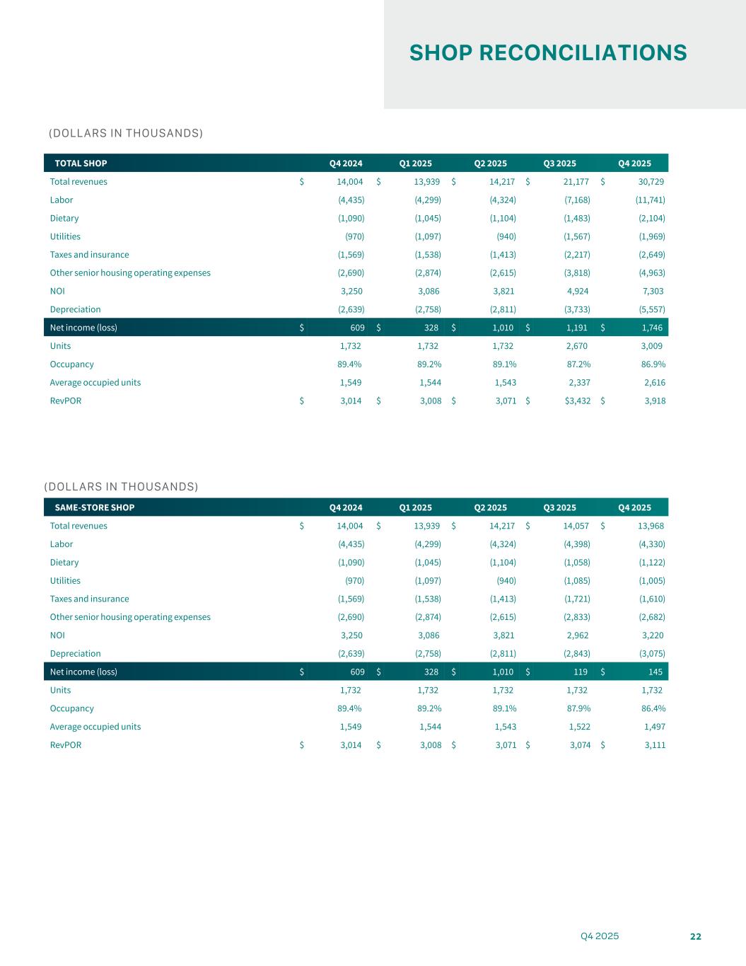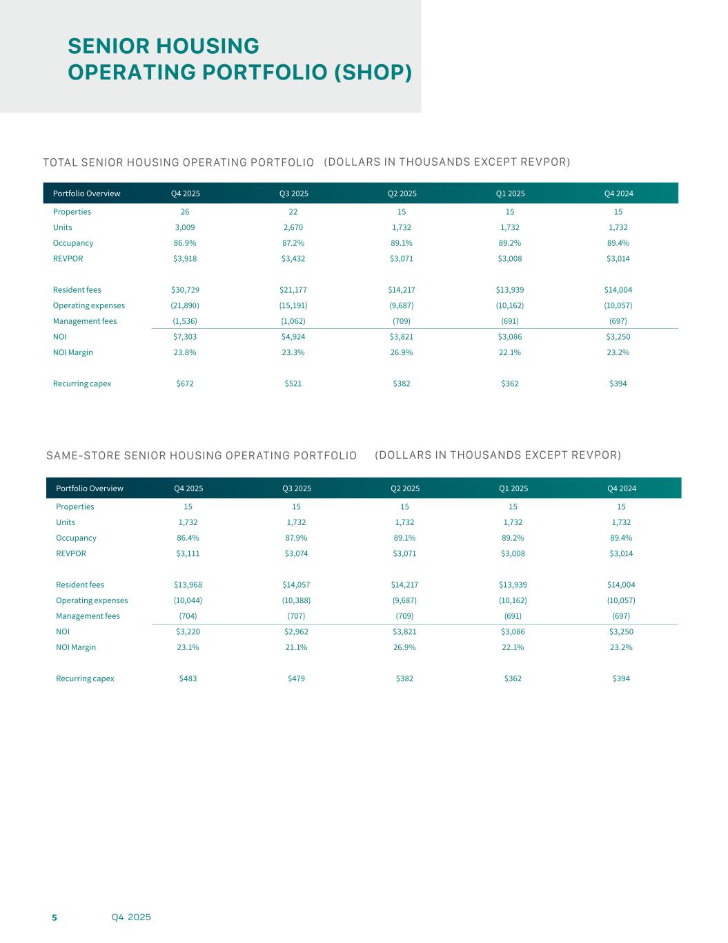 5 Q4 2025 SENIOR HOUSING OPERATING PORTFOLIO (SHOP) ˜ “„€ “…€ “€ “€ “„„ † € € € … †‡ ‡… ‡… ‡… ŠŠ Š‹ ƒ†ˆ ƒ‡ˆ ƒˆ ƒˆ ƒˆ„ —™ ‚… ƒ ‚… „… ‚… ‡ ‚… ƒ ‚… „ ‚… ‡29 ‚ ‡‡ ‚„ ‡ ‚… … ‚„ „ š ƒ0) € †ƒ‡ † €‡ Œ €…† † ‡ † †‡ ‚‡ …… ‚„ „ ‚… ƒ ‚… ƒ† ‚… € Œ …ˆƒ …ˆ… †ˆ ˆ …ˆ ŠŠ 𠂆‡ ‚€ ‚…ƒ ‚…† ‚…„ (DOLLARS IN THOUSANDS EXCEPT REVPOR) ˜ “„€ “…€ “€ “€ “„„ € € € € € ‡… ‡… ‡… ‡… ‡… ŠŠ Š‹ ƒ†ˆ„ ƒ‡ˆ ƒˆ ƒˆ ƒˆ„ —™ ‚… ‚… ‡„ ‚… ‡ ‚… ƒ ‚… „ ‚… †ƒ ‚„ €‡ ‚„ ‡ ‚… … ‚„ „ š „„ …ƒƒ †ƒ‡ † €‡ Œ ‡„ ‡‡ ‡ † †‡ ‚… ‚ † ‚… ƒ ‚… ƒ† ‚… € Œ …ˆ ˆ †ˆ ˆ …ˆ ŠŠ š ‚„ƒ… ‚„‡ ‚…ƒ ‚…† ‚…„ TOTAL SENIOR HOUSING OPERATING PORTFOLIO (DOLLARS IN THOUSANDS EXCEPT REVPOR)SAME-STORE SENIOR HOUSING OPERATING PORTFOLIO