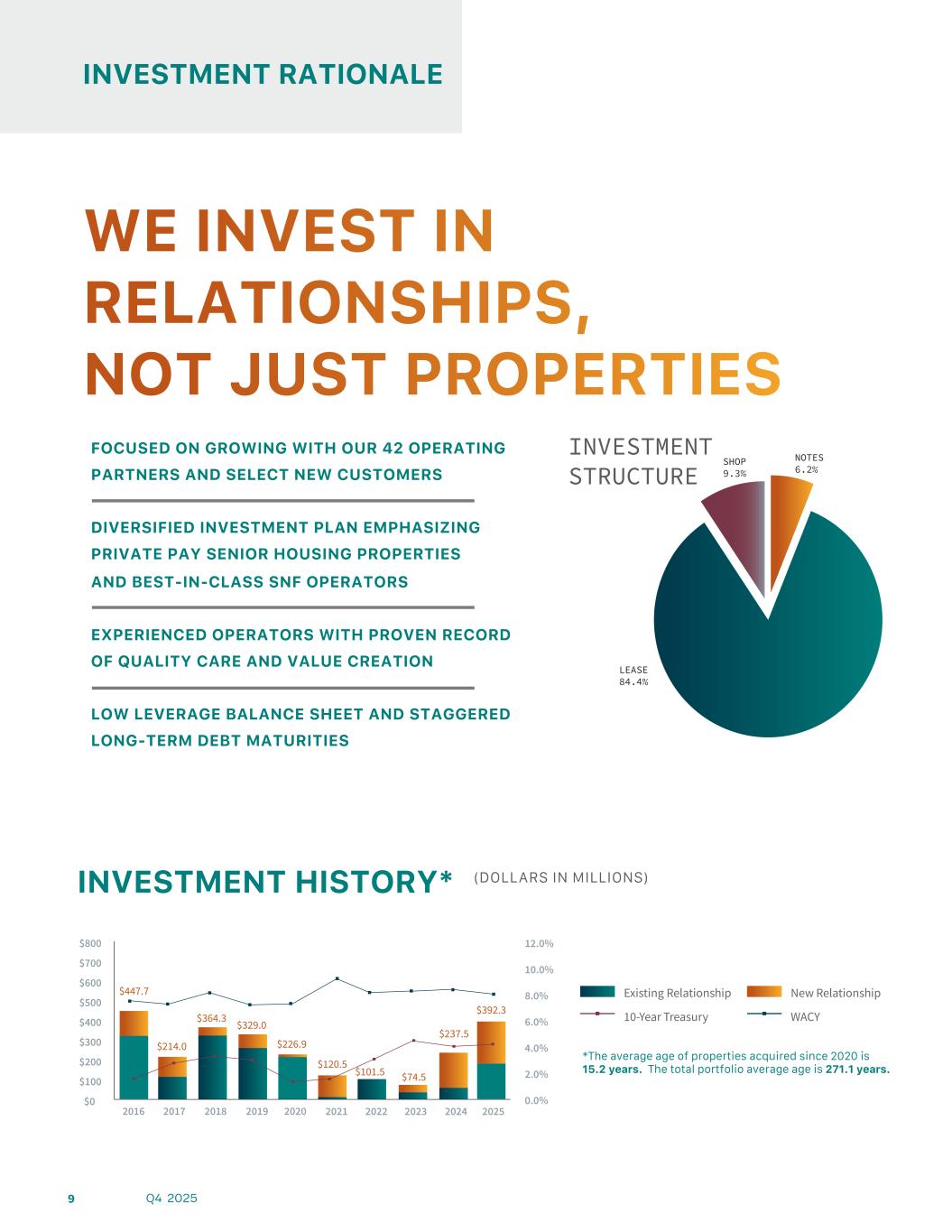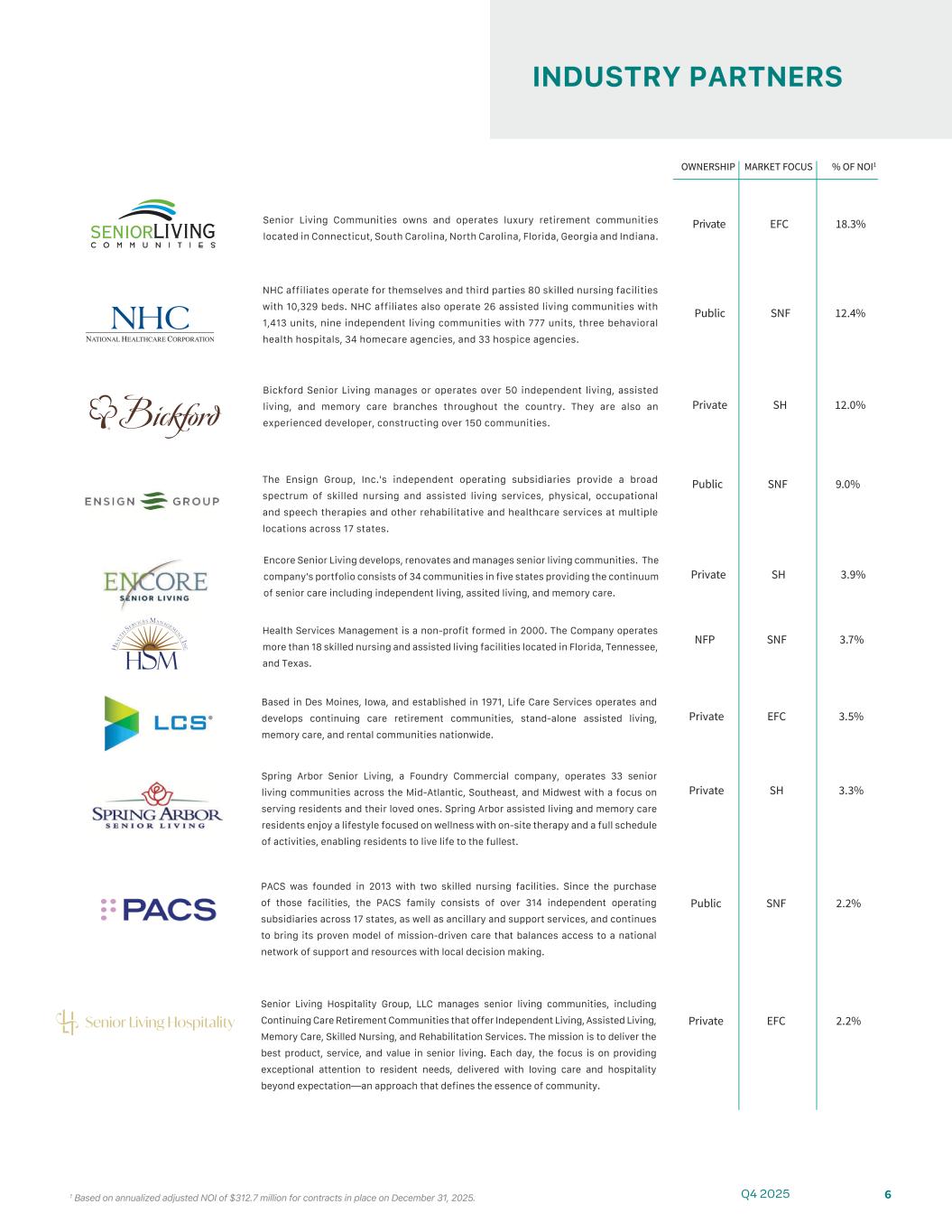 6Q4 2025 ›— Œœ—•ž •Ÿ 1 Based on annualized adjusted NOI of $312.7 million for contracts in place on December 31, 2025. INDUSTRY PARTNERS ˆ Bickford Senior Living manages or operates over 50 independent living, assisted living, and memory care branches throughout the country. They are also an experienced developer, constructing over 150 communities. ‘Š • ˆ„ NHC affiliates operate for themselves and third parties 80 skilled nursing facilities with 10,329 beds. NHC affiliates also operate 26 assisted living communities with 1,413 units, nine independent living communities with 777 units, three behavioral health hospitals, 34 homecare agencies, and 33 hospice agencies. —•ž ƒˆ…Senior Living Communities owns and operates luxury retirement communities located in Connecticut, South Carolina, North Carolina, Florida, Georgia and Indiana. ‘Š • ˆThe Ensign Group, Inc.'s independent operating subsidiaries provide a broad spectrum of skilled nursing and assisted living services, physical, occupational and speech therapies and other rehabilitative and healthcare services at multiple locations across 17 states. • • …ˆ‡ Health Services Management is a non-profi t formed in 2000. The Company operates more than 18 skilled nursing and assisted living facilities located in Florida, Tennessee, and Texas. —•ž …ˆ€ Based in Des Moines, Iowa, and established in 1971, Life Care Services operates and develops continuing care retirement communities, stand-alone assisted living, memory care, and rental communities nationwide. ‘Š • ˆ PACS was founded in 2013 with two skilled nursing facilities. Since the purchase of those facilities, the PACS family consists of over 314 independent operating subsidiaries across 17 states, as well as ancillary and support services, and continues to bring its proven model of mission-driven care that balances access to a national network of support and resources with local decision making. —•ž ˆ Senior Living Hospitality Group, LLC manages senior living communities, including Continuing Care Retirement Communities that offer Independent Living, Assisted Living, Memory Care, Skilled Nursing, and Rehabilitation Services. The mission is to deliver the best product, service, and value in senior living. Each day, the focus is on providing exceptional attention to resident needs, delivered with loving care and hospitality beyond expectation—an approach that defi nes the essence of community. …ˆ Encore Senior Living develops, renovates and manages senior living communities. The company's portfolio consists of 34 communities in fi ve states providing the continuum of senior care including independent living, assited living, and memory care. …ˆ… Spring Arbor Senior Living, a Foundry Commercial company, operates 33 senior living communities across the Mid-Atlantic, Southeast, and Midwest with a focus on serving residents and their loved ones. Spring Arbor assisted living and memory care residents enjoy a lifestyle focused on wellness with on-site therapy and a full schedule of activities, enabling residents to live life to the fullest.