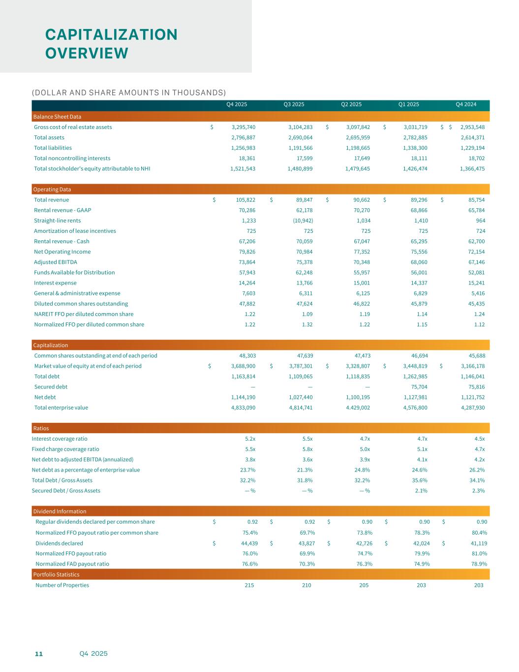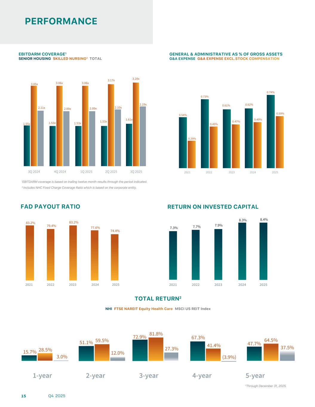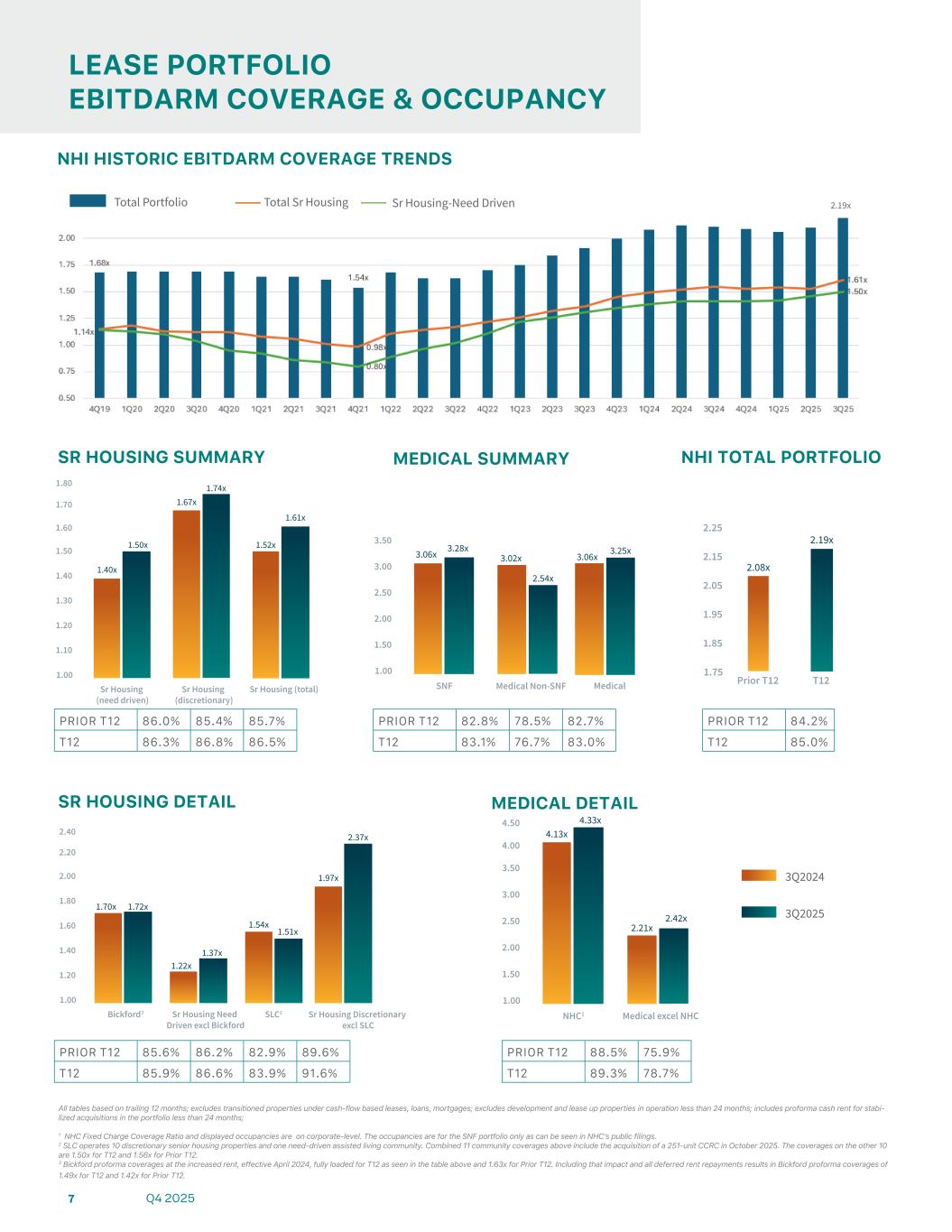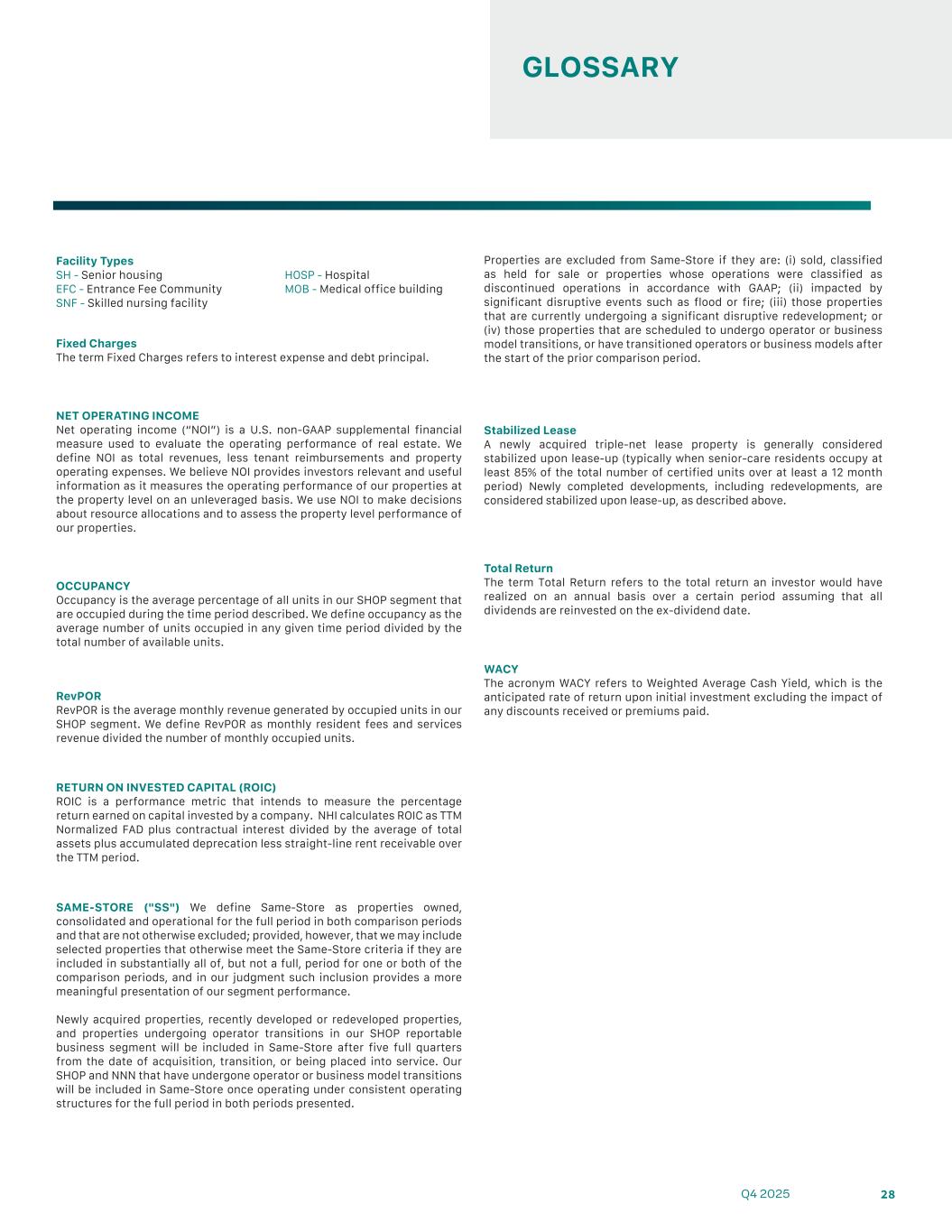 28Q4 2025 Properties are excluded from Same-Store if they are: (i) sold, classifi ed as held for sale or properties whose operations were classifi ed as discontinued operations in accordance with GAAP; (ii) impacted by signifi cant disruptive events such as fl ood or fi re; (iii) those properties that are currently undergoing a signifi cant disruptive redevelopment; or (iv) those properties that are scheduled to undergo operator or business model transitions, or have transitioned operators or business models after the start of the prior comparison period. Stabilized Lease A newly acquired triple-net lease property is generally considered stabilized upon lease-up (typically when senior-care residents occupy at least 85% of the total number of certifi ed units over at least a 12 month period) Newly completed developments, including redevelopments, are considered stabilized upon lease-up, as described above. Total Return The term Total Return refers to the total return an investor would have realized on an annual basis over a certain period assuming that all dividends are reinvested on the ex-dividend date. WACY The acronym WACY refers to Weighted Average Cash Yield, which is the anticipated rate of return upon initial investment excluding the impact of any discounts received or premiums paid. Facility Types SH - Senior housing HOSP - Hospital EFC - Entrance Fee Community MOB - Medical offi ce building SNF - Skilled nursing facility Fixed Charges The term Fixed Charges refers to interest expense and debt principal. NET OPERATING INCOME Net operating income (“NOI”) is a U.S. non-GAAP supplemental fi nancial measure used to evaluate the operating performance of real estate. We defi ne NOI as total revenues, less tenant reimbursements and property operating expenses. We believe NOI provides investors relevant and useful information as it measures the operating performance of our properties at the property level on an unleveraged basis. We use NOI to make decisions about resource allocations and to assess the property level performance of our properties. OCCUPANCY Occupancy is the average percentage of all units in our SHOP segment that are occupied during the time period described. We defi ne occupancy as the average number of units occupied in any given time period divided by the total number of available units. RevPOR RevPOR is the average monthly revenue generated by occupied units in our SHOP segment. We defi ne RevPOR as monthly resident fees and services revenue divided the number of monthly occupied units. RETURN ON INVESTED CAPITAL (ROIC) ROIC is a performance metric that intends to measure the percentage return earned on capital invested by a company. NHI calculates ROIC as TTM Normalized FAD plus contractual interest divided by the average of total assets plus accumulated deprecation less straight-line rent receivable over the TTM period. SAME-STORE ("SS") We defi ne Same-Store as properties owned, consolidated and operational for the full period in both comparison periods and that are not otherwise excluded; provided, however, that we may include selected properties that otherwise meet the Same-Store criteria if they are included in substantially all of, but not a full, period for one or both of the comparison periods, and in our judgment such inclusion provides a more meaningful presentation of our segment performance. Newly acquired properties, recently developed or redeveloped properties, and properties undergoing operator transitions in our SHOP reportable business segment will be included in Same-Store after fi ve full quarters from the date of acquisition, transition, or being placed into service. Our SHOP and NNN that have undergone operator or business model transitions will be included in Same-Store once operating under consistent operating structures for the full period in both periods presented. GLOSSARY