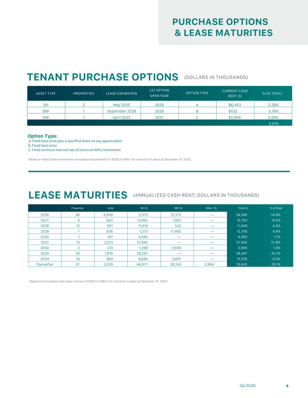 LEASE PORTFOLIO EBITDARM COVERAGE & OCCUPANCY 7 Q4 2025 SR HOUSING SUMMARY MEDICAL SUMMARY NHI TOTAL PORTFOLIO SR HOUSING DETAIL MEDICAL DETAIL PRIOR T12 86.0% 85.4% 85.7% T12 86.3% 86.8% 86.5% PRIOR T12 85.6% 86.2% 82.9% 89.6% T12 85.9% 86.6% 83.9% 91.6% PRIOR T12 82.8% 78.5% 82.7% T12 83.1% 76.7% 83.0% PRIOR T12 88.5% 75.9% T12 89.3% 78.7% PRIOR T12 84.2% T12 85.0% All tables based on trailing 12 months; excludes transitioned properties under cash-flow based leases, loans, mortgages; excludes development and lease up properties in operation less than 24 months; includes proforma cash rent for stabi- lized acquisitions in the portfolio less than 24 months; 1 NHC Fixed Charge Coverage Ratio and displayed occupancies are on corporate-level. The occupancies are for the SNF portfolio only as can be seen in NHC's public filings. 2 SLC operates 10 discretionary senior housing properties and one need-driven assisted living community. Combined 11 community coverages above include the acquisition of a 251-unit CCRC in October 2025. The coverages on the other 10 are 1.50x for T12 and 1.56x for Prior T12. 3 Bickford proforma coverages at the increased rent, effective April 2024, fully loaded for T12 as seen in the table above and 1.63x for Prior T12. Including that impact and all deferred rent repayments results in Bickford proforma coverages of 1.49x for T12 and 1.42x for Prior T12. ” NHI HISTORIC EBITDARM COVERAGE TRENDS …“„ …“€ ˆš