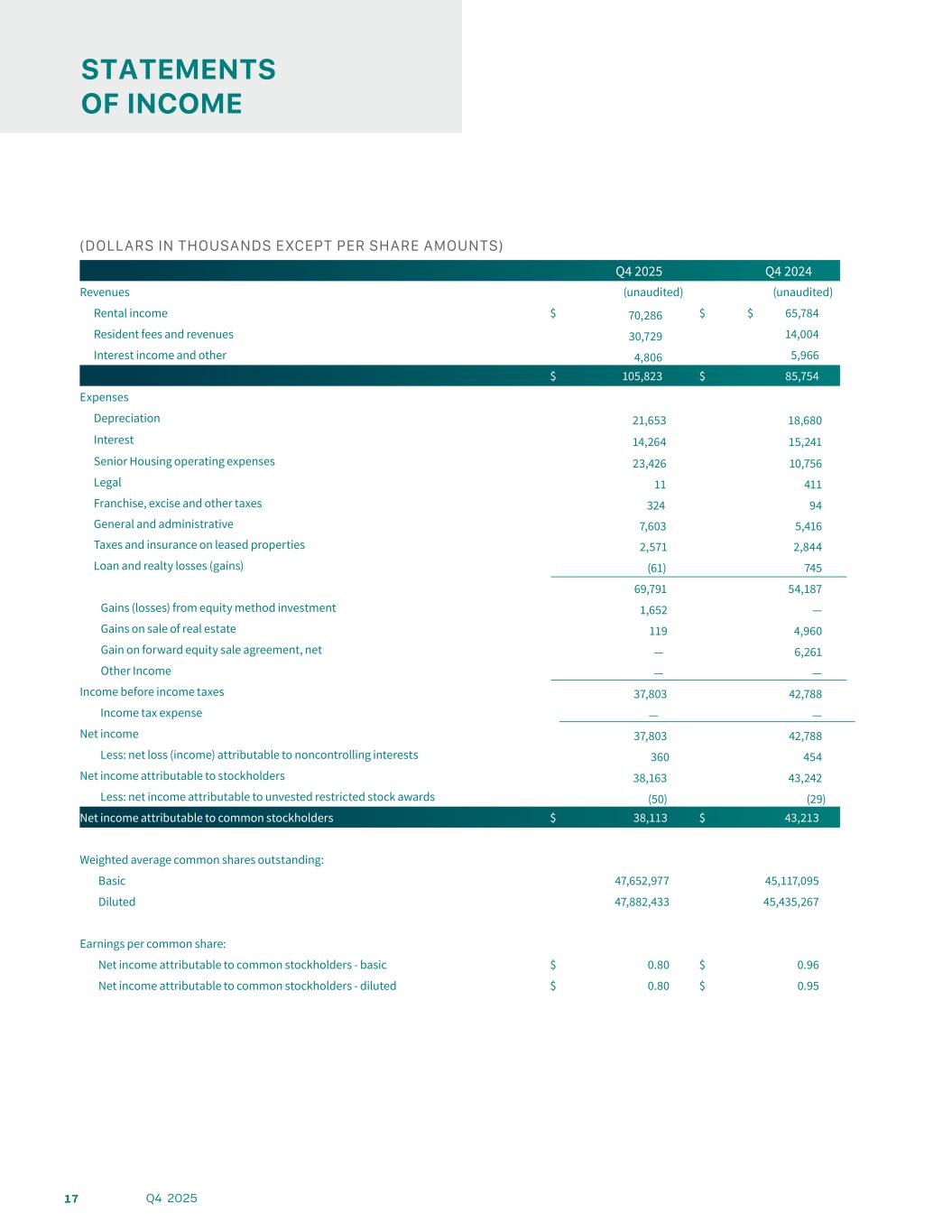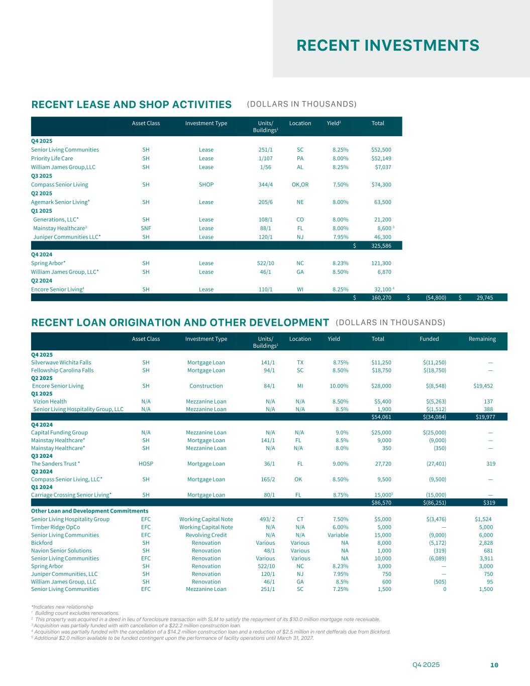 10Q4 2025 *Indicates new relationship 1 Building count excludes renovations. 2 This property was acquired in a deed in lieu of foreclosure transaction with SLM to satisfy the repayment of its $10.0 million mortgage note receivable. 3 Acquisition was partially funded with with cancellation of a $22.2 million construction loan. 4 Acquisition was partially funded with the cancellation of a $14.2 million construction loan and a reduction of $2.5 million in rent defferals due from Bickford. 5 Additional $2.0 million available to be funded contingent upon the performance of facility operations until March 31, 2027. ž ‹ ¤ ¢ Š – • ž €¤ ž ƒˆ€ ‚€ € ‹ ž ¤‡ ƒˆ ‚€ „ ›¥ ¦ ž ¤€† ƒˆ€ ‚‡ …‡ ž …„„¤„ œ ‡ˆ€ ‚‡„ … ‰ § €¤† — ƒˆ †… € ‚ ‡ ‚ ¨ ¦ ž§ ƒ¤ ž ƒˆ ‚ ‡ ‚ ¨ Œ‹ ŽŠ … • ƒƒ¤ • ƒˆ ƒ † … ¥ ž ž§ ¤ ¥ ‡ˆ€ „† … ‚ …€ €ƒ† ‚ €„ ƒ ‚ ‡„€ ‘§ €¤ ž ƒˆ… … ›¥ ¦ ž§ „†¤ ¦ ƒˆ€ † ƒ‡ —Š „ ¤ › ƒˆ€ … „ ‚ † ‡ ‚ €„ ƒ ‚ ‡„€ ž ‹ ¤ ¢ Š – • ˜ ›ŠŽ• Œ „¤ ¡ ƒˆ‡€ ‚ € ‚ € ¨ ¨ • ˜Ž ž• Œ „¤ ž ƒˆ€ ‚ƒ ‡€ ‚ƒ ‡€ ¨ —Š žŠ ƒ„¤ Œ ˆ ‚ƒ ‚ƒ €„ƒ ‚ „€ ™ Ž ¤ Œ ¤ ¤ ƒˆ€ ‚€ „ ‚€ †… …‡ ‹¦ ž ¤ Œ ¤ ¤ ƒˆ€ ‚ € …ƒƒ ‚€„ † ‚…„ ƒ„ ‚ ‡‡ ž •¦ ¤ Œ ¤ ¤ ˆ ‚€ ‚€ ¨ Œ‹ ŽŠ § Œ „¤ • ƒˆ€ ¨ Œ‹ ŽŠ § Œ ¤ ¤ ƒˆ …€ …€ ¨ Ž § Œ …†¤ • ˆ ‡ ‡ ‡ „ … ž ž§ Œ †€¤ œ ƒˆ€ € € ¨ ž ž § Œ ƒ¤ • ƒˆ‡€ € © € ¨ ‚ƒ† €‡ ‚ƒ† € ‚… €‚ƒ ƒƒ„ƒ… ‹¦ —•ž ›‰ž „…¤ ž ‡ˆ€ ‚€ ‚… „‡† ‚ €„ ‘ ž —•ž ›‰ž ¤ ¤ †ˆ € ¨ € ¨ ž —•ž ž ¤ ¤ ™‘ € † ¢Š‰ ™ ™ ƒ € ‡ ƒƒ „ƒ¤ ™ … †ƒ ž —•ž ™ ™ † ƒ … ‘ €¤ ž ƒˆ… … ¨ … ¥ ž ž ¤ ¥ ‡ˆ€ ‡€ ¨ ‡€ ›¥ ¦ ž „†¤ ¦ ƒˆ€ † €€ € ž —•ž Œ €¤ ž ‡ˆ€ € € RECENT INVESTMENTS RECENT LEASE AND SHOP ACTIVITIES (DOLLARS IN THOUSANDS) RECENT LOAN ORIGINATION AND OTHER DEVELOPMENT (DOLLARS IN THOUSANDS)