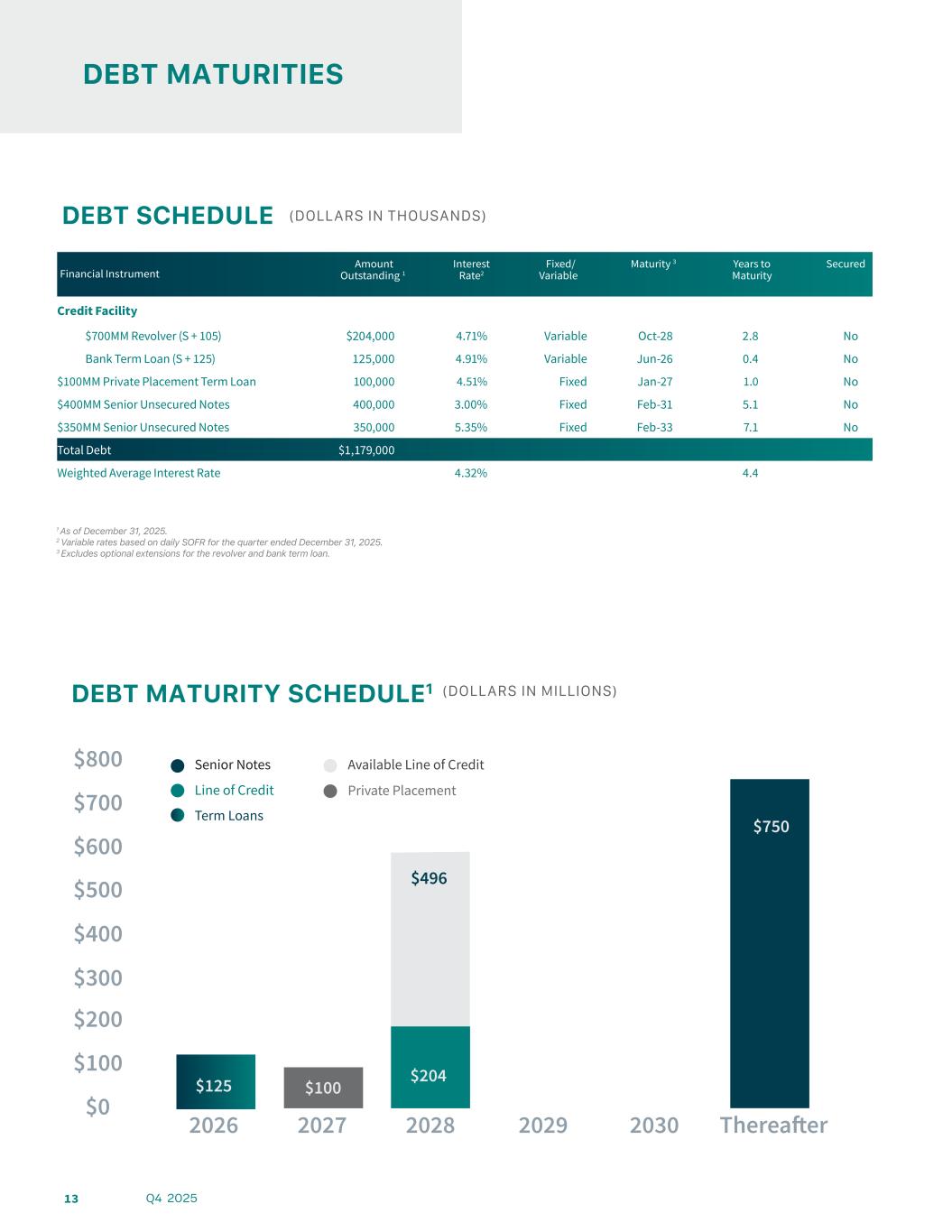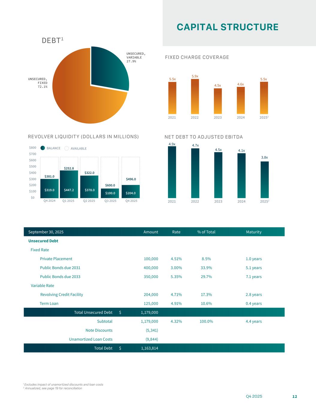 12Q4 2025 CAPITAL STRUCTURE NET DEBT TO ADJUSTED EBITDA 1 Excludes impact of unamortized discounts and loan costs 2 Annualized, see page 19 for reconciliation REVOLVER LIQUIDITY (DOLLARS IN MILLIONS) ‘ … € Œ‹ …†‡ ˆ •š Š „ˆ€ ƒˆ€ ˆ‹ ‘Š¢ … „ …ˆ ……ˆ €ˆ‹ ‘Š¢ …… …€ €ˆ…€ ˆ‡ ‡ˆ‹ ™‘ ž •Š‹ „ „ˆ‡ ‡ˆ… ˆƒ‹ € „ˆ ˆ† ˆ„‹ Š ‘ ‚ ‡ ‘ ‡ „ˆ… ˆ „ˆ„‹ Š € …„ ž ƒ„„ ‘ ‚ †… ƒ„ UNSECURED, VARIABLE 27.9% UNSECURED, FIXED 72.1% DEBT1 Lease Notes unsecured, v FIXED CHARGE COVERAGE “„€ “…€ “€ “€ “„„ ¢Š Ž ¦Š ‚ … € ‡„ … „ ƒ… ‚ … ‡ ƒ„ ‚ … … ‡ ‚ ‚ €… €„ƒ ‡† ƒƒ‡ † †„ †€ € ‡ƒ ƒƒ€ †„ …‡ ‘ €† ƒ… €†† ƒ ††€ ……ƒ … „ Š ƒ …† ‡ € ‡ †„ ƒ ƒ ‡ Š‰Ž £ ª‹‘‘ € €„… „ƒ ƒ „‡ †„€ „† „‡„ …†† „‡€ ‚ € ƒ ‚ ƒ ƒ„‡ ‚ †† ‚ ƒ † ‚ ƒ€ ‡€„ ”¦ ‡ ƒ† † ‡ƒ ‡ ‡ †ƒ ƒ†† †€ ‡ƒ„ Ž” …… „ …„ „ †„ Š ‡€ ‡€ ‡€ ‡€ ‡„ ”žŽ †‡ † ‡ € †‡ „‡ †€ € † ‡ Š ‡ ƒ† ‡ ƒ„ ‡‡ …€ ‡€ €€† ‡ €„ —¢ ‡… ƒ†„ ‡€ …‡ƒ ‡ …„ƒ †ƒ † †‡ „† •‘ ‘ €‡ „… † „ƒ €€ €‡ €† € ƒ š „ †„ … ‡†† € „ ……‡ € „ ¦ « š ‡ †… † … † € † ƒ € „† ŠŽ „‡ ƒƒ „‡ †„ „† ƒ „€ ƒ‡ „€ „…€ —•• ŠŽ ˆ ˆ ˆ ˆ„ ˆ„ •• ŠŽ ˆ ˆ… ˆ ˆ€ ˆ ž žŽ ŠŽ „ƒ …… „‡ †… „‡ „‡… „† †„ „€ †ƒƒ Œ‰ ª‹ ŠŽ ‚ … †ƒƒ ‚ … ‡ƒ‡ … ‚ … …ƒ ƒ‡ ‚ … „„ƒ ƒ ‚ … †† ‡ƒ ‘ †… ƒ„ †€ ƒ ƒ…€ † ƒ€ „† „ Š ‘ ¨ ¨ ¨ ‡€ ‡„ ‡€ ƒ† ‘ „„ ‡ „„ € ‡ ƒ ‡€ „ ƒ…… „ ƒ„ ‡„ „ˆ„ „ €‡† ƒ „ ƒ‡ … Š €ˆš €ˆ€š „ˆ‡š „ˆ‡š „ˆ€š •š ŠŽ Š €ˆ€š €ˆƒš €ˆš €ˆš „ˆ‡š ‘ —¢ …ˆƒš …ˆ†š …ˆš „ˆš „ˆš ‘ Š …ˆ‡ ˆ… „ˆƒ „ˆ† †ˆ ‘¤¦ …ˆ …ˆƒ …ˆ …€ˆ† …„ˆ Š ‘¤¦ ¨ ¨ ¨ ˆ ˆ… Š ŠŽ ‚ ˆ ‚ ˆ ‚ ˆ ‚ ˆ ‚ ˆ •• ‹ ŠŽ ‡€ˆ„ †ˆ‡ ‡…ˆƒ ‡ƒˆ… ƒˆ„ Š ‚ „„ „… ‚ „… ƒ‡ ‚ „ ‡† ‚ „ „ ‚ „ •• ‹ ‡†ˆ †ˆ ‡„ˆ‡ ‡ˆ ƒˆ • ‹ ‡†ˆ† ‡ˆ… ‡†ˆ… ‡„ˆ ‡ƒˆ Š ‘ € € … …
