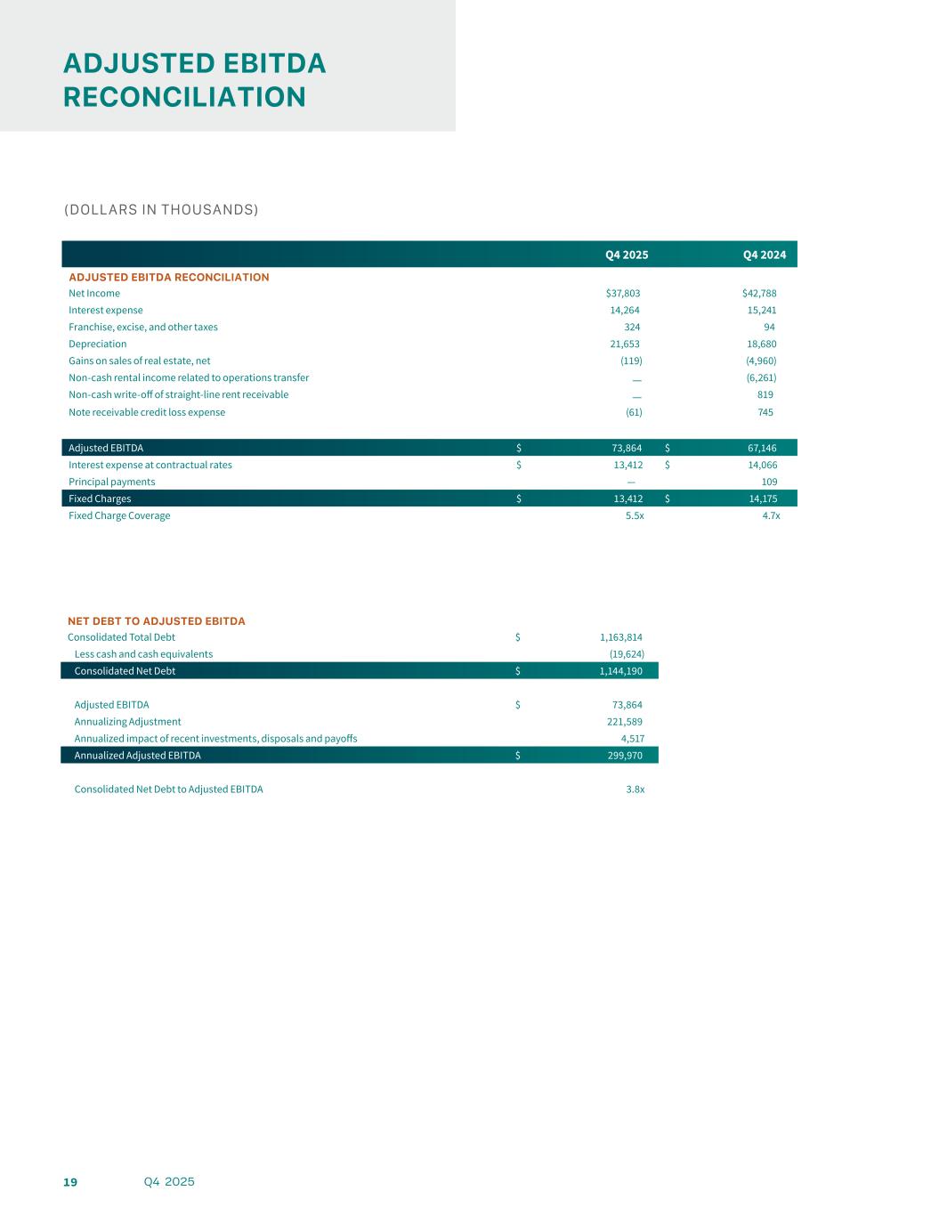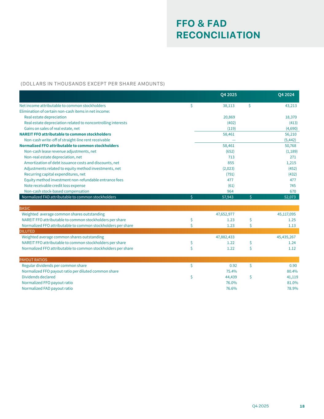 18Q4 2025 FFO & FAD RECONCILIATION (DOLLARS IN THOUSANDS EXCEPT PER SHARE AMOUNTS) Š ‘‘ ŠŠ‰Ž ‚ …ƒ … ‚ „… … —Š ”ŠŽ Š ² Š ƒ† ƒ …‡ Š Š „ „… ¦ „ † ‰‰„ˆ‡ˆ€†ƒƒ…†‹€ … €ƒ „† €† ”ŠŽ˜ ” ́ Ž” Š ‘ ¨ € „„ ƒ€„Œ ‰‰„ˆ‡ˆ€†ƒƒ…†‹€ … €ƒ „† € ‡†ƒ ”ŠŽ †€ ƒ ” Š ‡… ‡ ‘Š ŠŠ ƒ€€ € ª‹ Ž … „€ ŠŠ š ‡ „… —ª‹ Ž ” ‘ Š „‡‡ „‡‡ Š ‘ Š š † ‡„€ ”ŠŽŠ‰”‘ Š †„ †‡ •‘‘ ŠŠ‰Ž ‚ €‡ „… ‚ € ‡… ¢ž › Ž ŠŽ „‡ †€ ‡‡ „€ ‡ € —••‘‘ ŠŠ‰Ž Ž ‚ ˆ… ‚ ˆ€ ••‘‘ ŠŠ‰Ž Ž ‚ ˆ… ‚ ˆ… — › Ž ŠŽ „‡ ƒƒ „…… „€ „…€ †‡ —••‘‘ ŠŠ‰Ž Ž ‚ ˆ ‚ ˆ„ ••‘‘ ŠŠ‰Ž Ž ‚ ˆ ‚ ˆ – ŠŽ ‚ ˆ ‚ ˆ •• ‹ ŠŽ ‡€ˆ„ ƒˆ„ Š ‚ „„ „… ‚ „ •• ‹ ‡†ˆ ƒˆ • ‹ ‡†ˆ† ‡ƒˆ